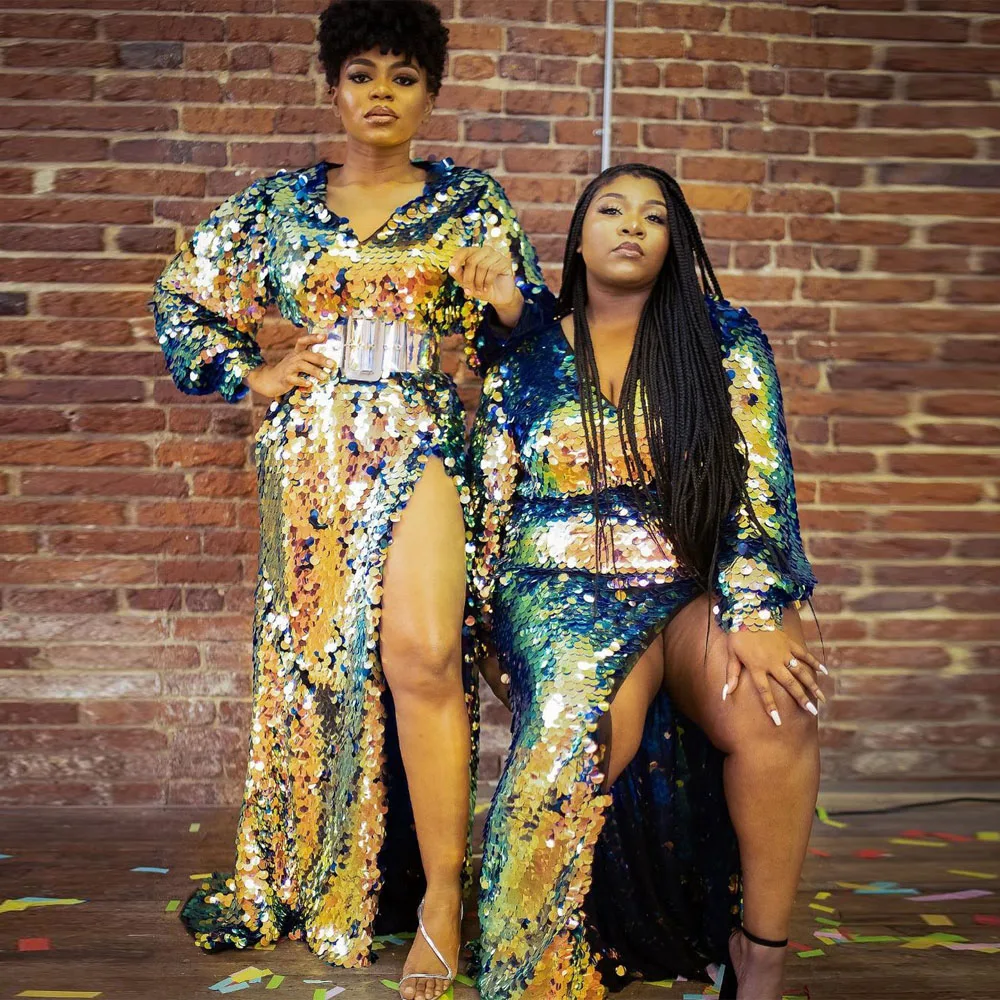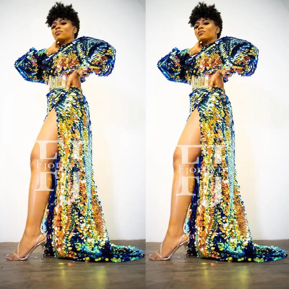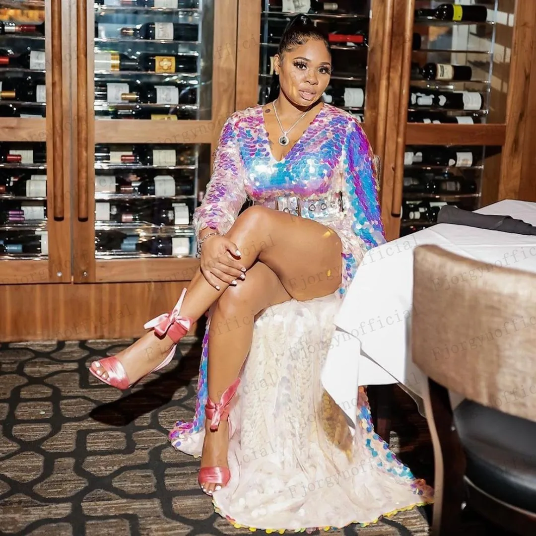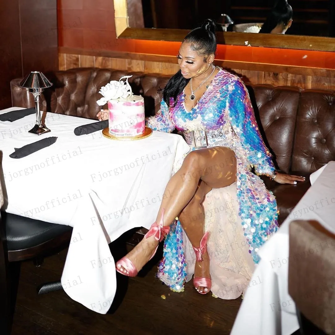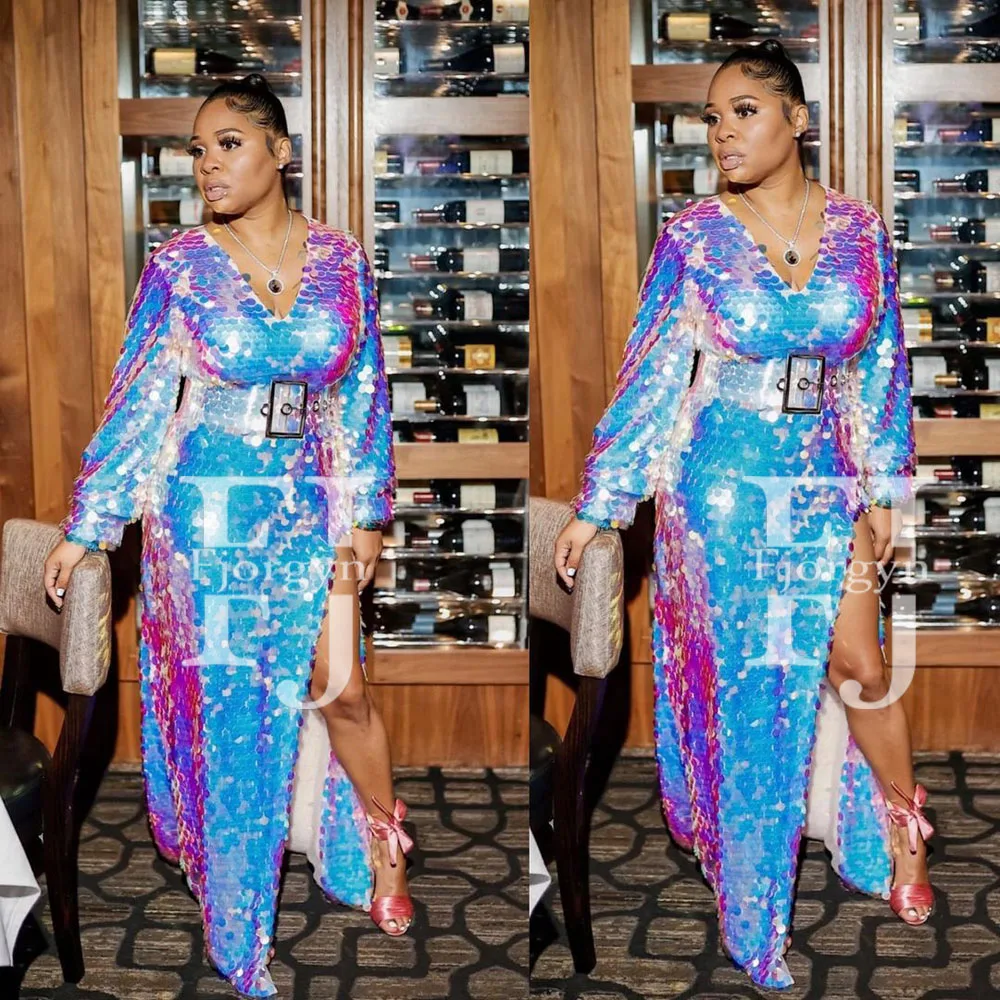 Сверкающие пикантные градиент платья с пайетками индивидуальный заказ с длинным рукавом высокого Разделение женские элегантные платья для вечеринки платье Ins же Стиль