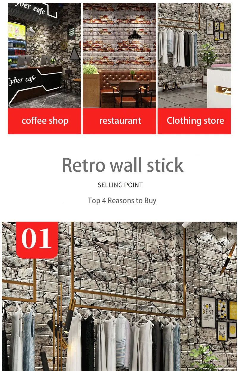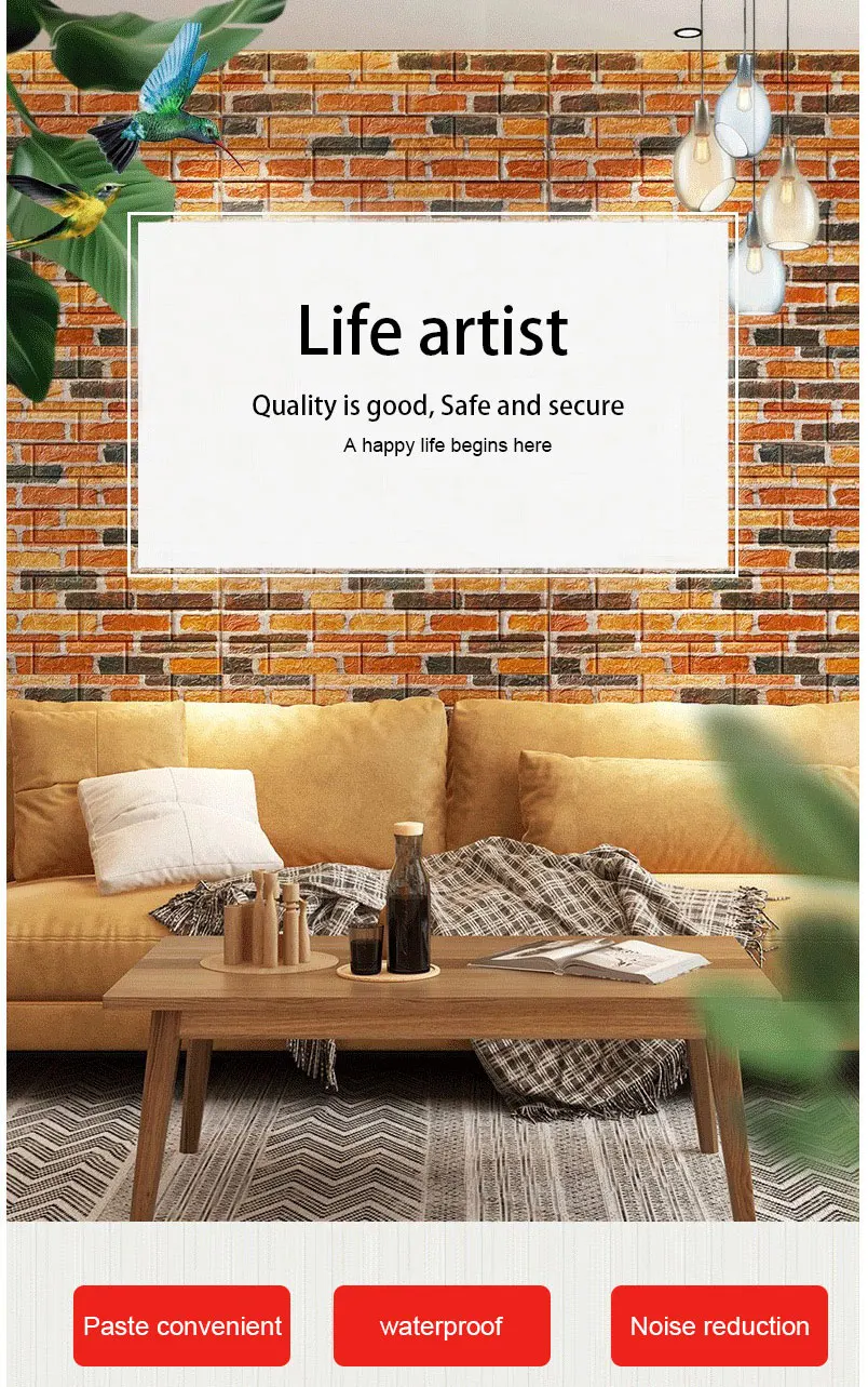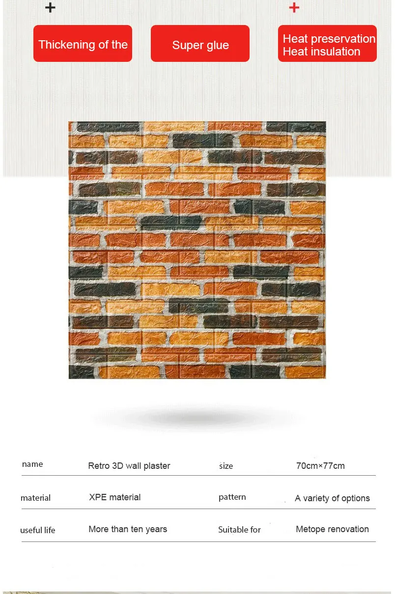 Характеристика: 1: трехмерная декоративная мягкая пена, защита от столкновений для детей, забота о вашей семье.2: Безопасность и защита окружающей среды, нетоксичный запах, подходит для семейного безопасного домашнего пространства.3: Реалистичный, естественный эффект кирпичного узора, простой и современный стиль.4: Бесплатный DIY, простой самоклеящийся дизайн, установка, повседневный коллаж, произвольный крой.5: сравнение обоев с улучшенным эффектом шумоподавления. Способы установки и инструменты Подготовка: Очистите поверхность с адгезией, например: поверхность из дерева, поверхность из стекла, не Пылезащитная стена, нажмите на дно шпатлевки и так далее. Паста: на заднюю крышку разорвана бумага, приклеенная К вспомогательным инструментам: ножницы, нож Внимание: пожалуйста, купите достаточное количество единиц товара, чтобы убедиться, что они поставляются из одной партии, чтобы избежать разницы в цвете.