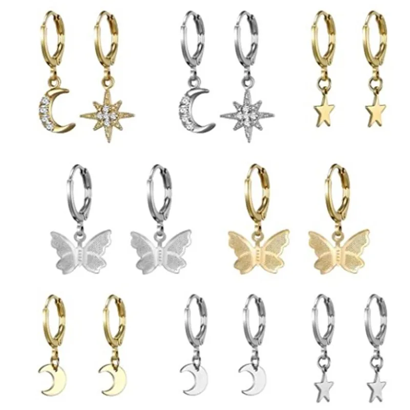 Комплект сережек-бабочек 2021 Женский, Модный комплект из 8 пар золотых сережек с подвесками-крестами, звездой, месяцем и звездой, ювелирные изделия