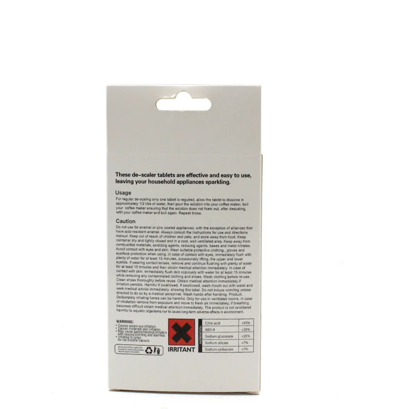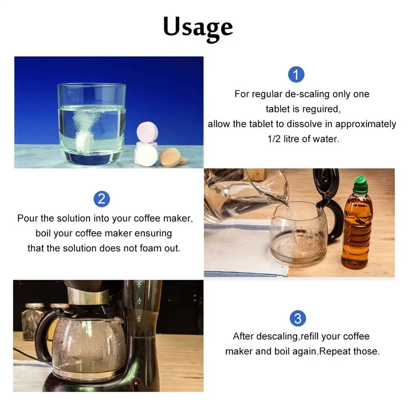 Для регулярной очистки требуется только одна таблетка, дайте таблетке раствориться в теплой воде. Затем Налейте раствор в кофемашину, Вскипятите кофеварка, чтобы раствор не вспенился. После удаления накипи Пополняйте свою кофеварку и снова варите.