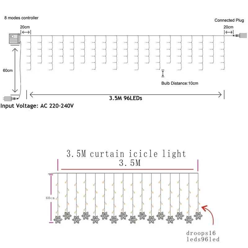 Описание:Особенности:100% абсолютно новый и высококачественный светодиодный светильник для льда* 96 огни 3,5 метров в длину (опустив 16)* Светодиодный подвесной светильник, каждый кулон* Пять цветов освещения, теплый белый, белый, многоцветный, синий, фиолетовый.* С 8 различными режимами: комбинация, волны, последовательно, Slo-glo, чеканка/вспышка, медленное выцветание, мерцание/вспышка, устойчивый. Вы можете использовать его в любом месте в любом режиме.* Уровень водонепроницаемости: IP44, что позволяет использовать лампы как внутри, так и снаружи. (вилка не является водонепроницаемой)* С хвостовым штекером, можно одновременно связать многие струнный светильник. (не более, чем подключить 8 струнный светильник)* Экономия энергии, долгая жизнь (теоретически До 50000 часов или более), светильник выбросов чистый, высокая яркость, движение не легко уничтожить, может быть повторно, холодная светильник источник, не легко нагревать.* Область применения: парковые деревья, городские ночные пейзажи, туристические аттракционы, сады, свадебные фоновые аранжировки, отели, рестораны, торговые здания, дома, окна, клубы, концерты, караоке-залы, модные шоу, танцевальные залы, сцены и т. Д. Расположение различных мест. Спецификация:Материал ПКДлина (Д X В):3.5Mx (0,4 м или 0,6 м) / 16Ft *(1.3Ft или 2Ft)Светодиодный Количество: 96 шт. светодиодный s-16 висит строки (0,4-0,6 м высота)Мощность: 6 ВтСветодиодный цвет: теплый белый/Разноцветный/синий/фиолетовыйЦвет кабеля: ПрозрачныйДлина провода вилки включает контроллер: 0,8 м/2.6фтНапряжение: ac220вВодонепроницаемость: IP44 (светильник водонепроницаемый, вы можете использовать его на открытом воздухе, но контроллер не является, вам нужно его защитить)
