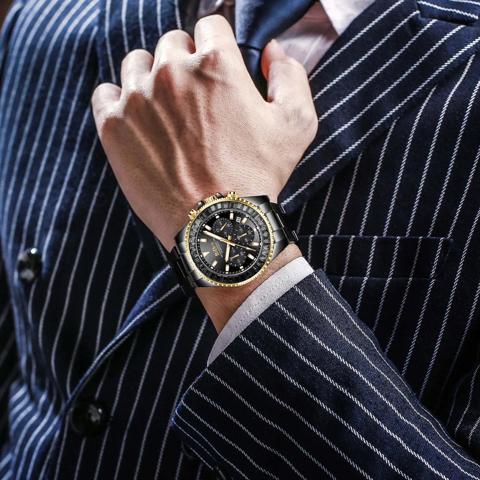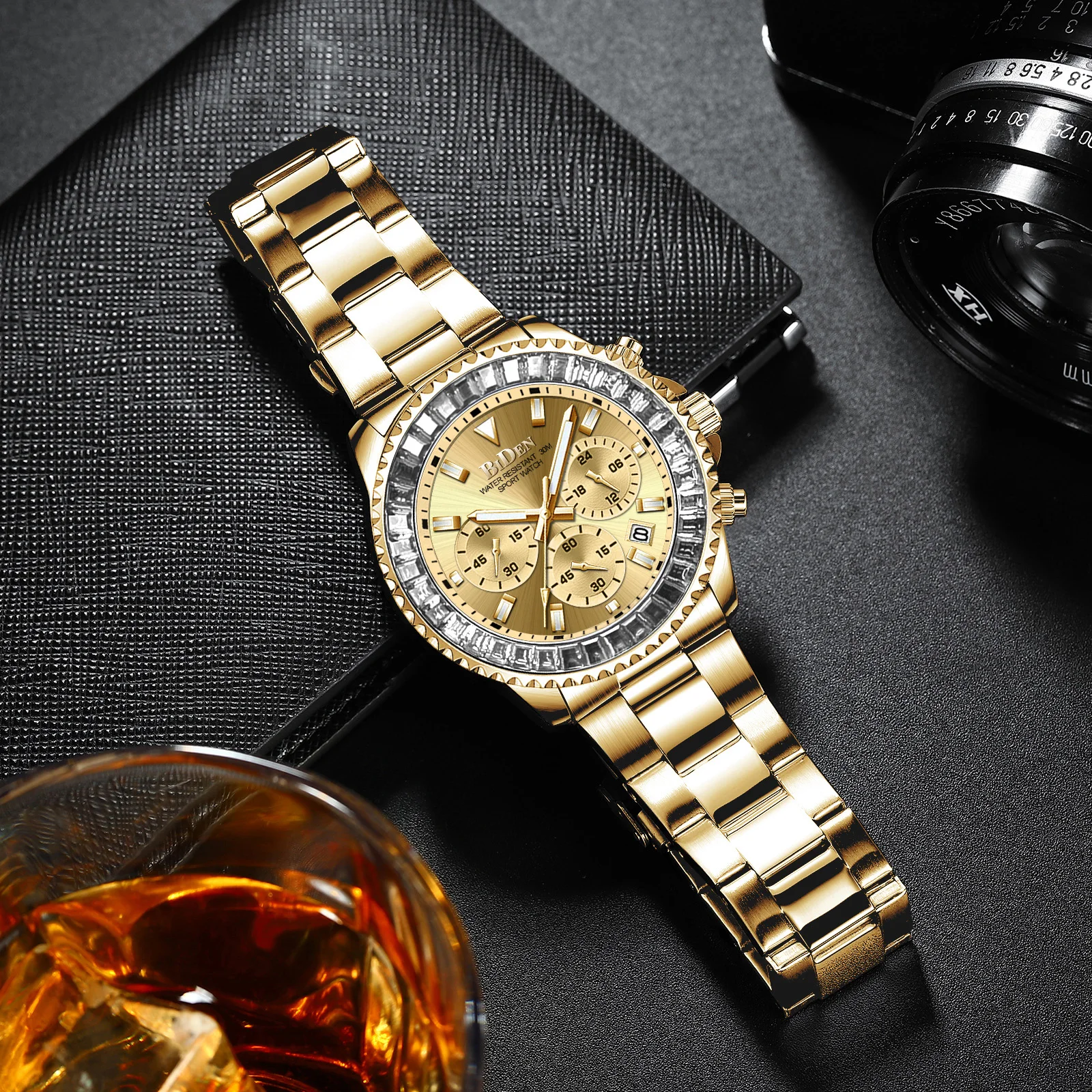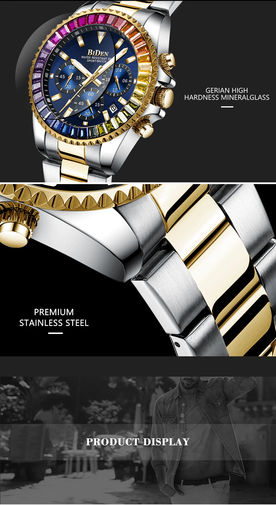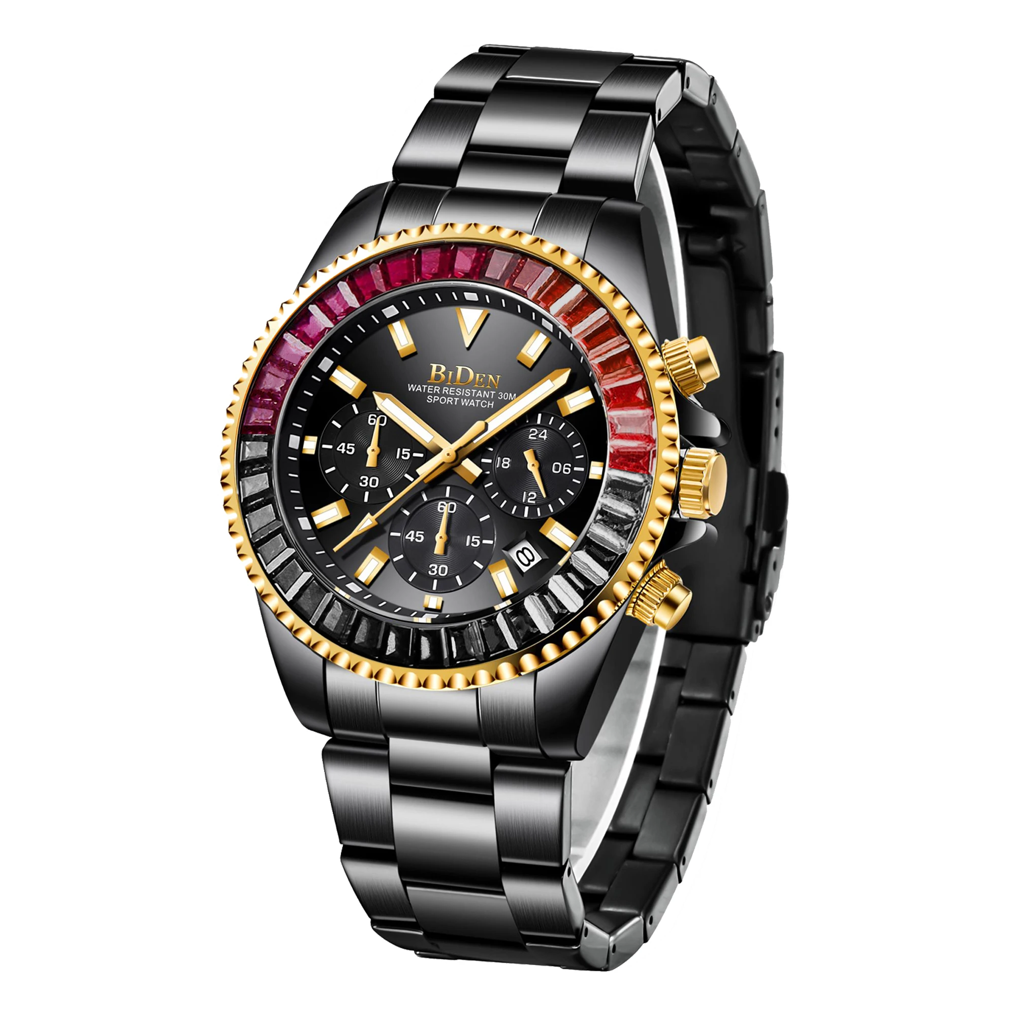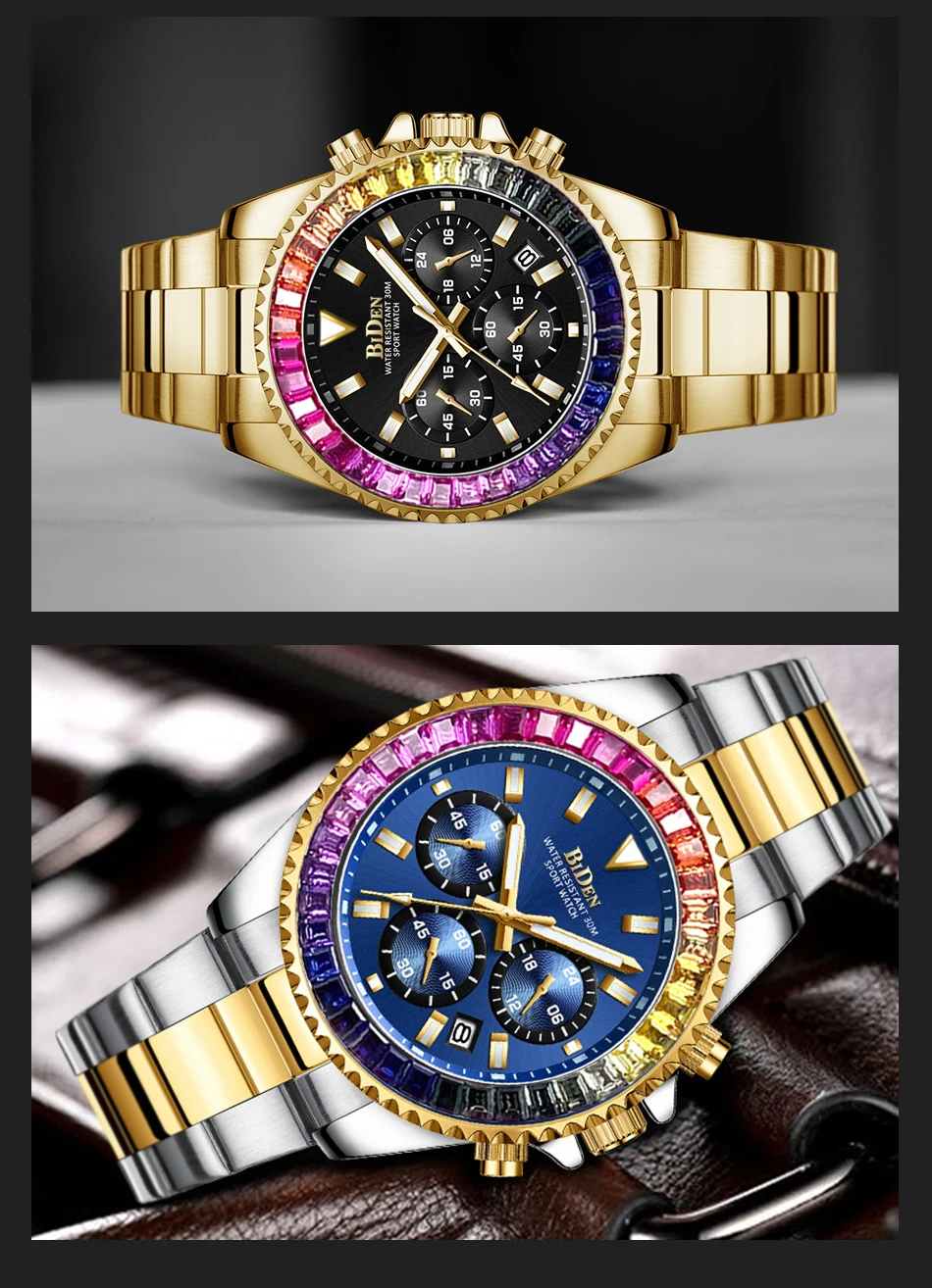 Мужские кварцевые аналоговые часы BIDEN с датой, хронограф из нержавеющей стали для дайвинга, водонепроницаемый светящийся дизайн, спортивные мужские часы