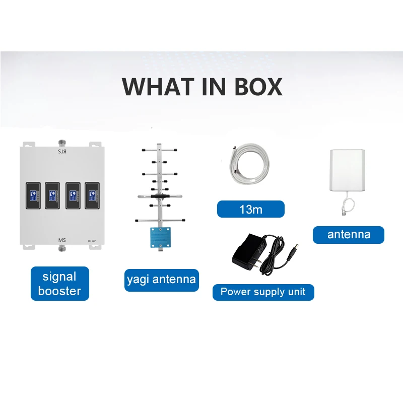 Посылка =800 МГц + 900 МГц + 1800 МГц + 2100 МГц четырехдиапазонный усилитель сигнала * 1+ Уличная Антенна yagi * 1+ Кабель 13 м * 1+ Внутренняя антенна * 1+ Источник питания EU/AU/UK/US * 1
