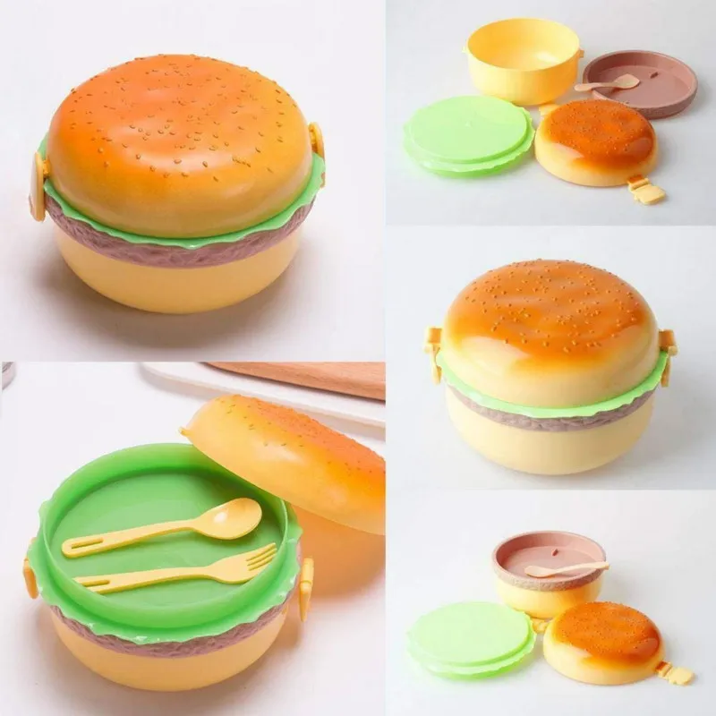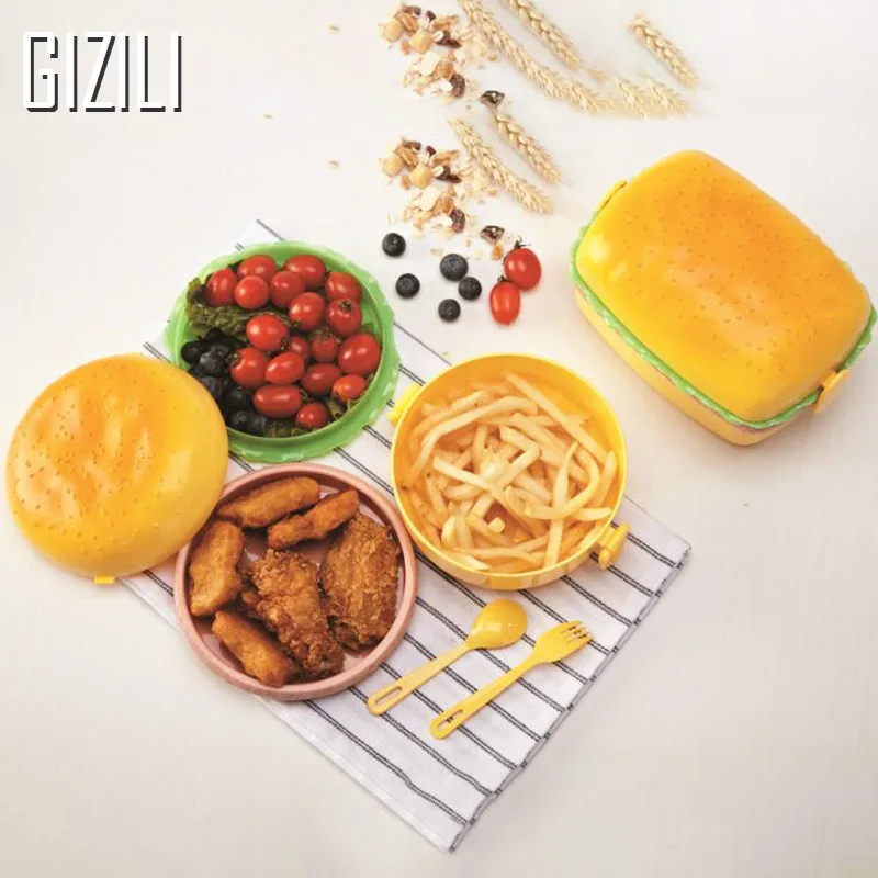 Новые Симпатичные Гамбургер двойной слой "Ланч-бокс" гамбургер коробка бенто Детские Ланч-боксы школьный контейнер для еды набор посуды с вилкой для детей