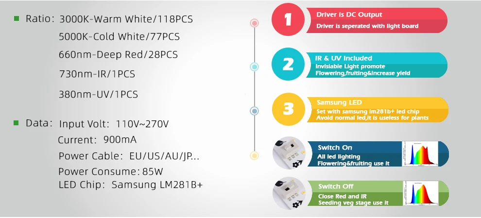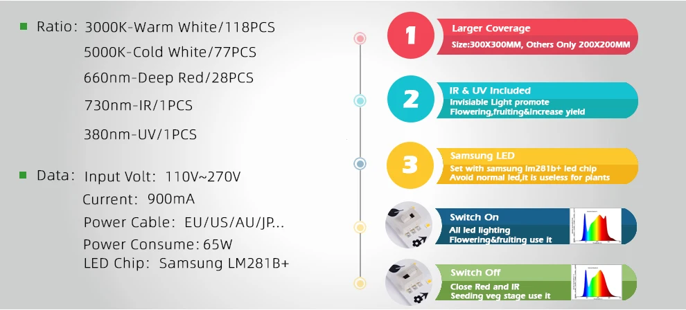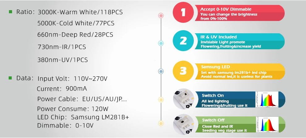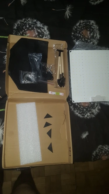 Все пришло в полном комплекте. Хорошая лампа за свою цену. Как заявляет продавец, покрывает нужный световой спектр для всей стадий роста растений. Проверим, по первым впечатлениям все отлично, посылка пришла быстро и в полном комплекте без повреждений, удобный диммируемый блок питания и свитч для переключения разных режимов.