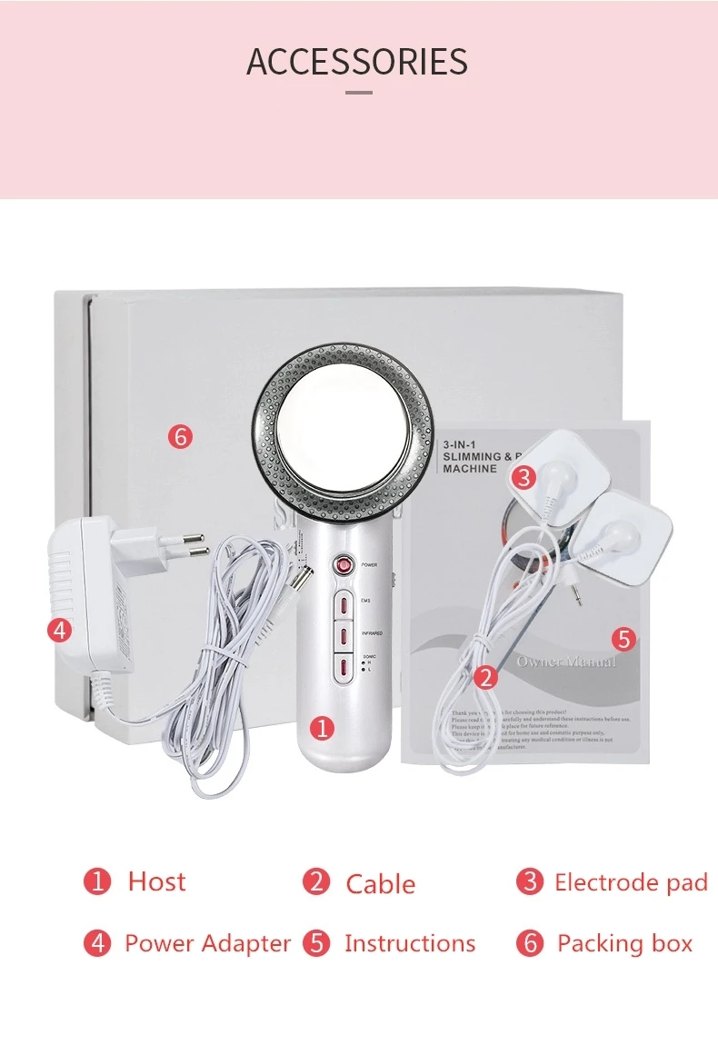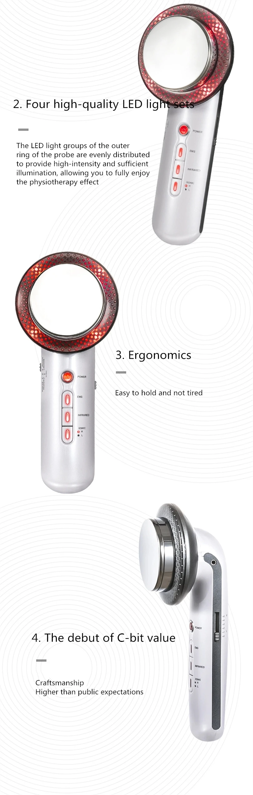 1. Ультразвуковой массаж: повышает проницаемость клеточных мембран, способствует впитыванию кожи, улучшает питание клеточных тканей и укрепляет способность регенерации клеточных тканей, также может разложить жир и подтянуть кожу. 2. Дальний инфракрасный: светодиодный светильник имеет сильную проницаемость, способствует гиперплазии коллагена, выцветанию тонких линий, восстанавливает эластичность кожи и восстанавливает клетки. 3.EMS Лечение: может активировать клетки, стимулировать мышцы пассивным движением, мышечное движение ускоряет потребление жира, чтобы достичь эффекта похудения. 4. Мини и стильный внешний вид, удобный для переноски и простой в использовании. 5. Для лица и тела.