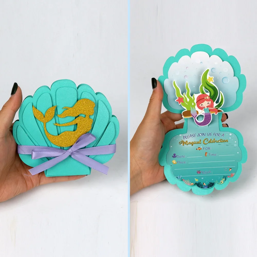 Приглашения в виде русалки OurWarm, 12 шт., перламутровые 3D, с конвертами, для детей, на день рождения, свадьбу, темативечерние праздничные принадлежности
