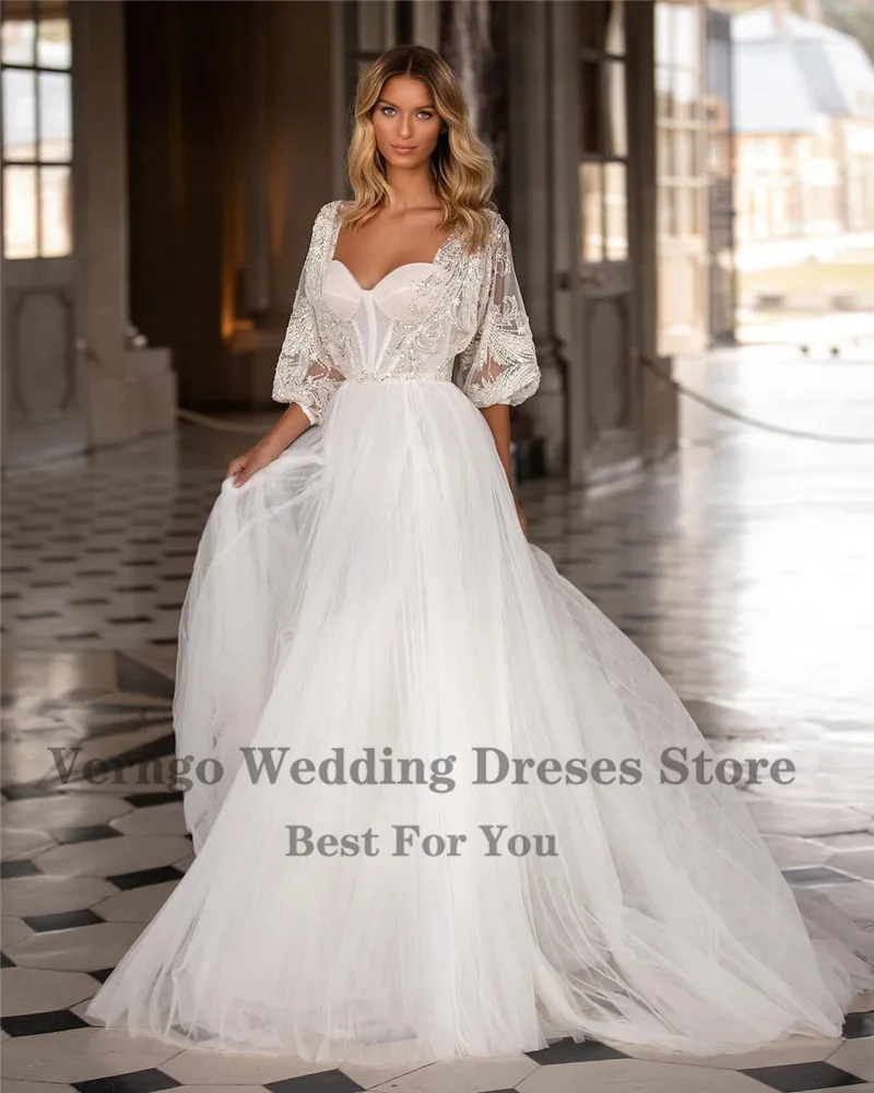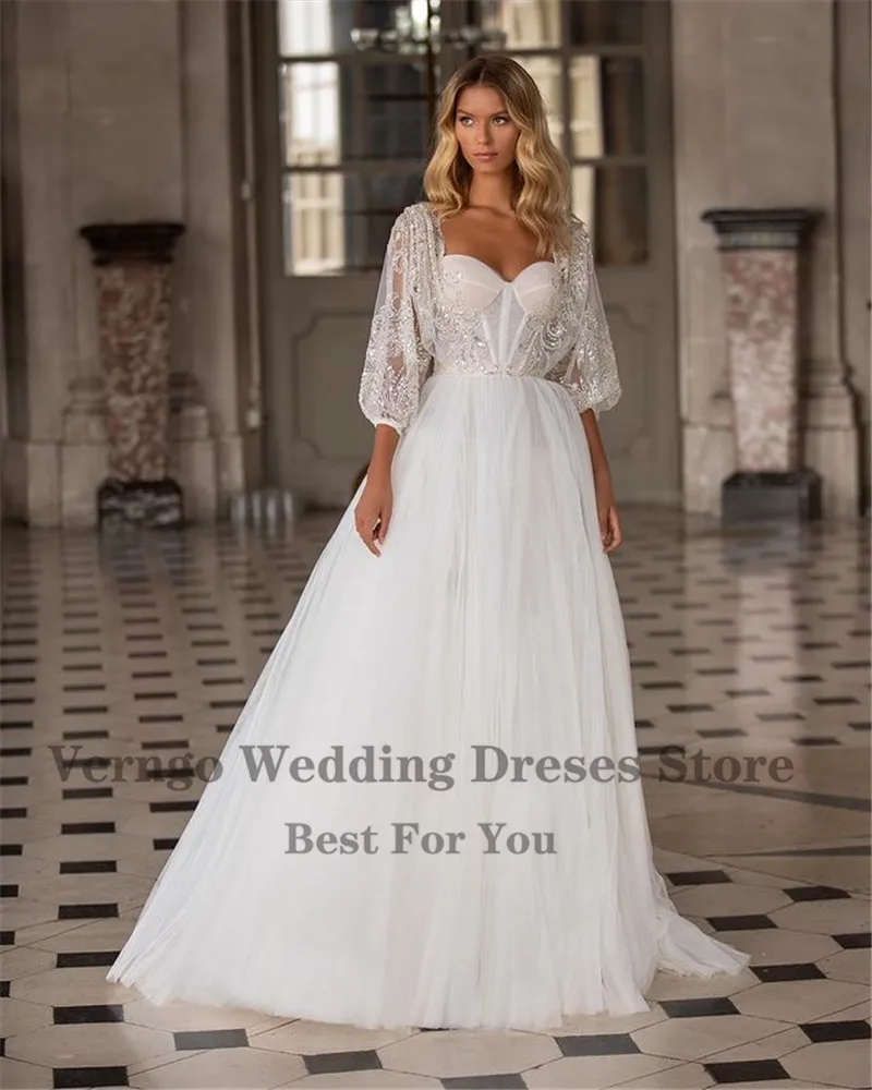 Платье Свадебное ТРАПЕЦИЕВИДНОЕ из фатина со съемным кружевным жакетом и бусинами на рукавах-фонариках