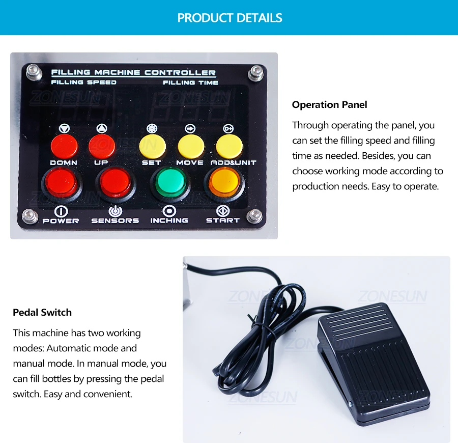 3. Желтый светильник: это ручной переключатель, который может установить время заполнения и громкость, а затем нажмите желтую кнопку для непрерывного заполнения,