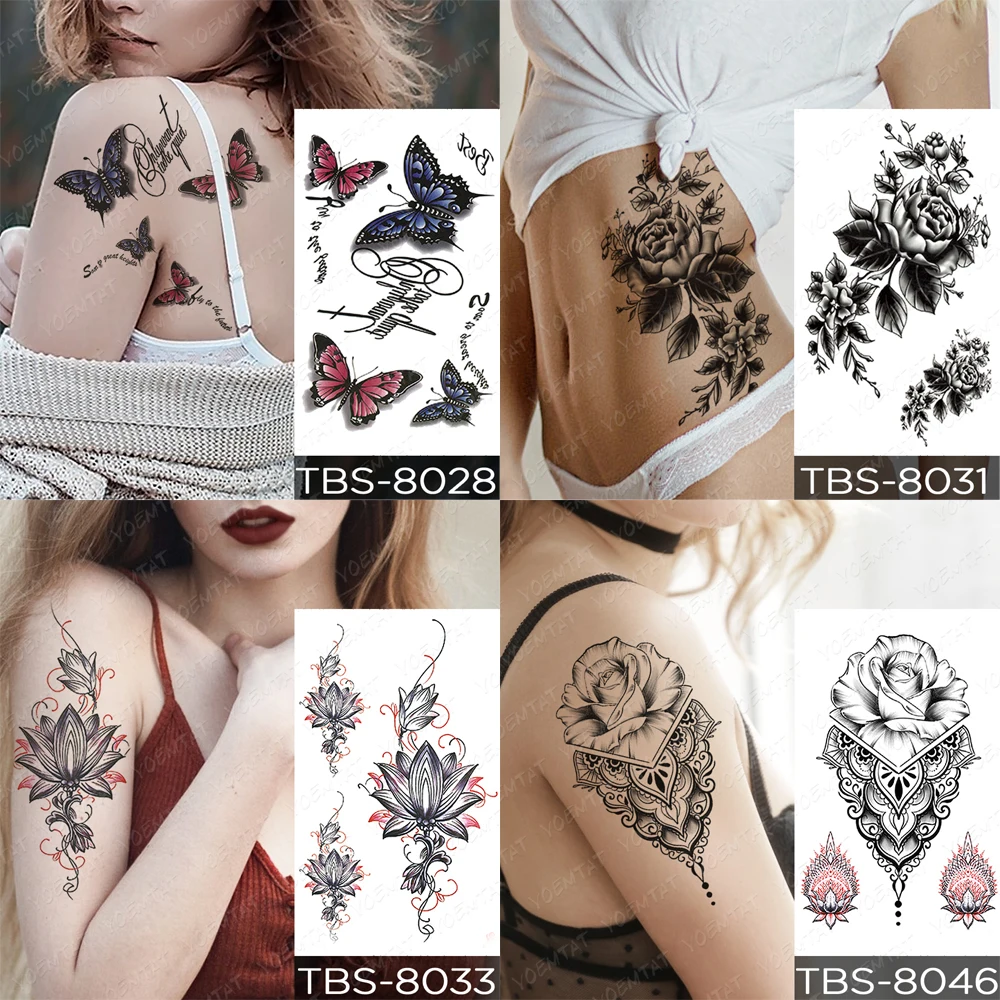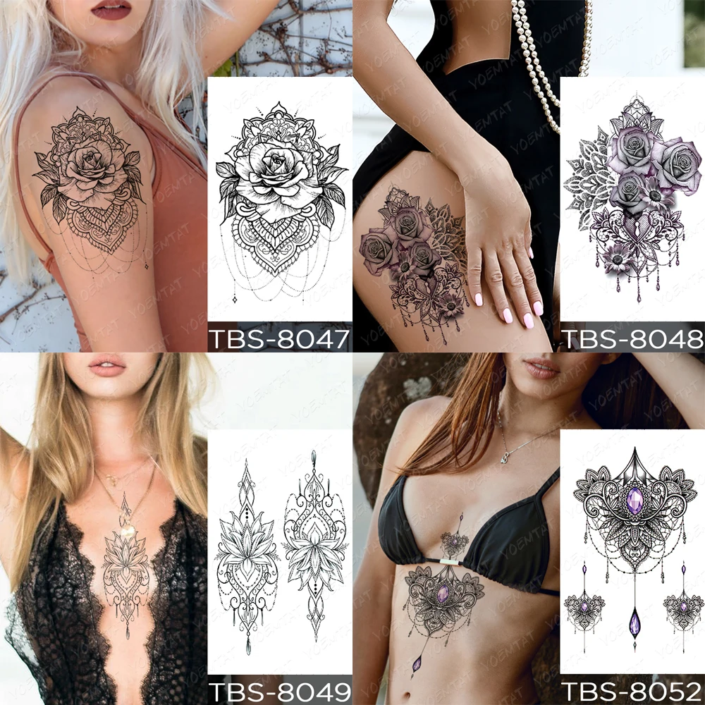 Водостойкая Временная тату-наклейка с цветами, розами, листьями, стразами, пионами, черные татуировки, боди-арт на руку, искусственная татуировка