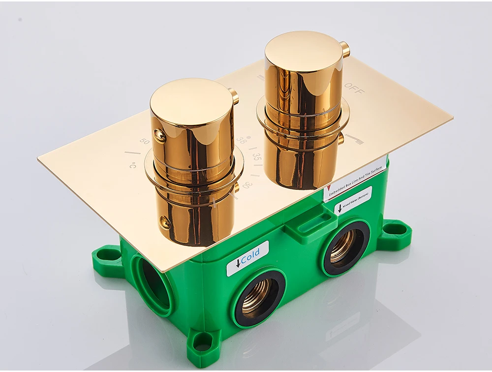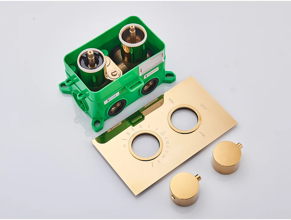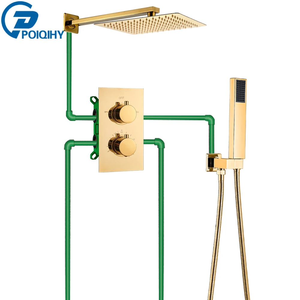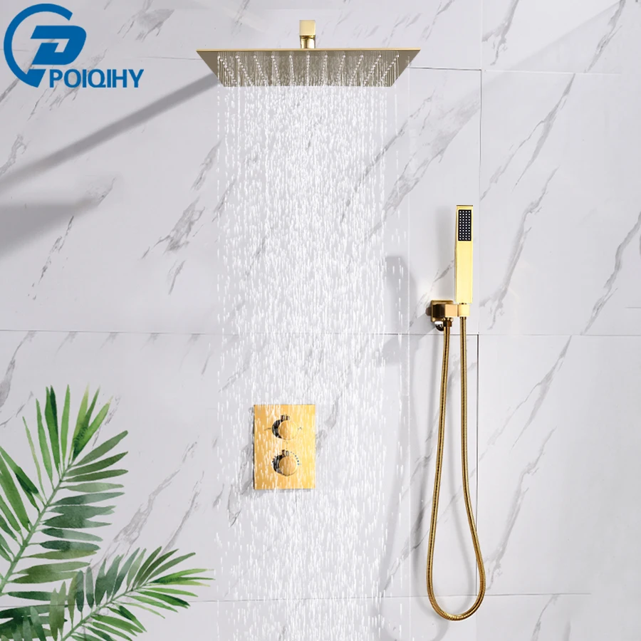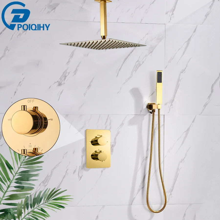 POIQIHY Золотой смеситель для душа с двойной ручкой, Термостатические Смесители для душа, Потолочная ванная комната, скрытый термостат, клапан, 2 способа