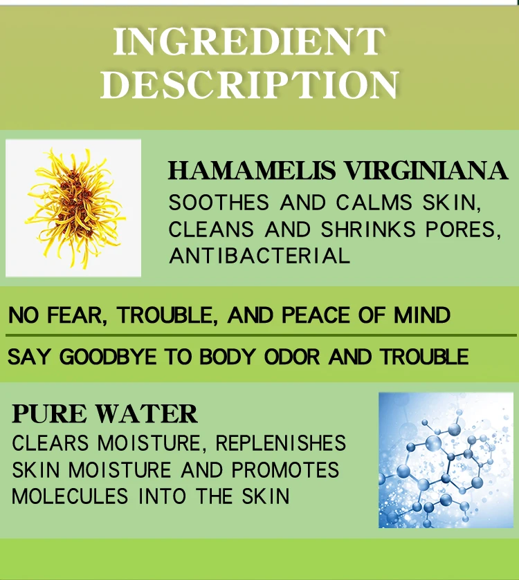 Содержит Свежий Экстракт AMAMELIS VIRGINIANA, текстура чистая и деликатная, достаточно свежая, не пачкается, распыляется, чтобы вымыть запах, пот, медленно отпускает светильник, попрощайтесь с запахом тела, увлажнением, глубокой кожей, нежностью, комфортом, не бойтесь и не беспокойтесь, избавьтесь от неприятностей и элегантности.