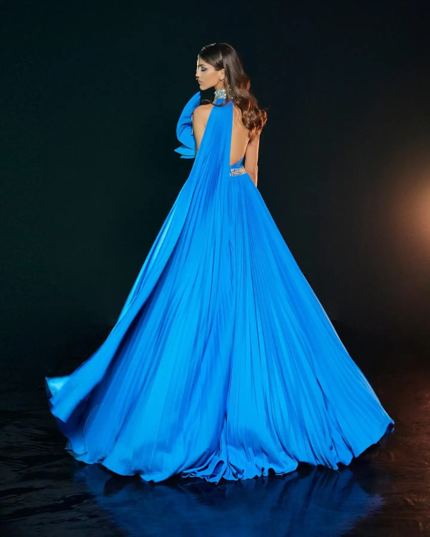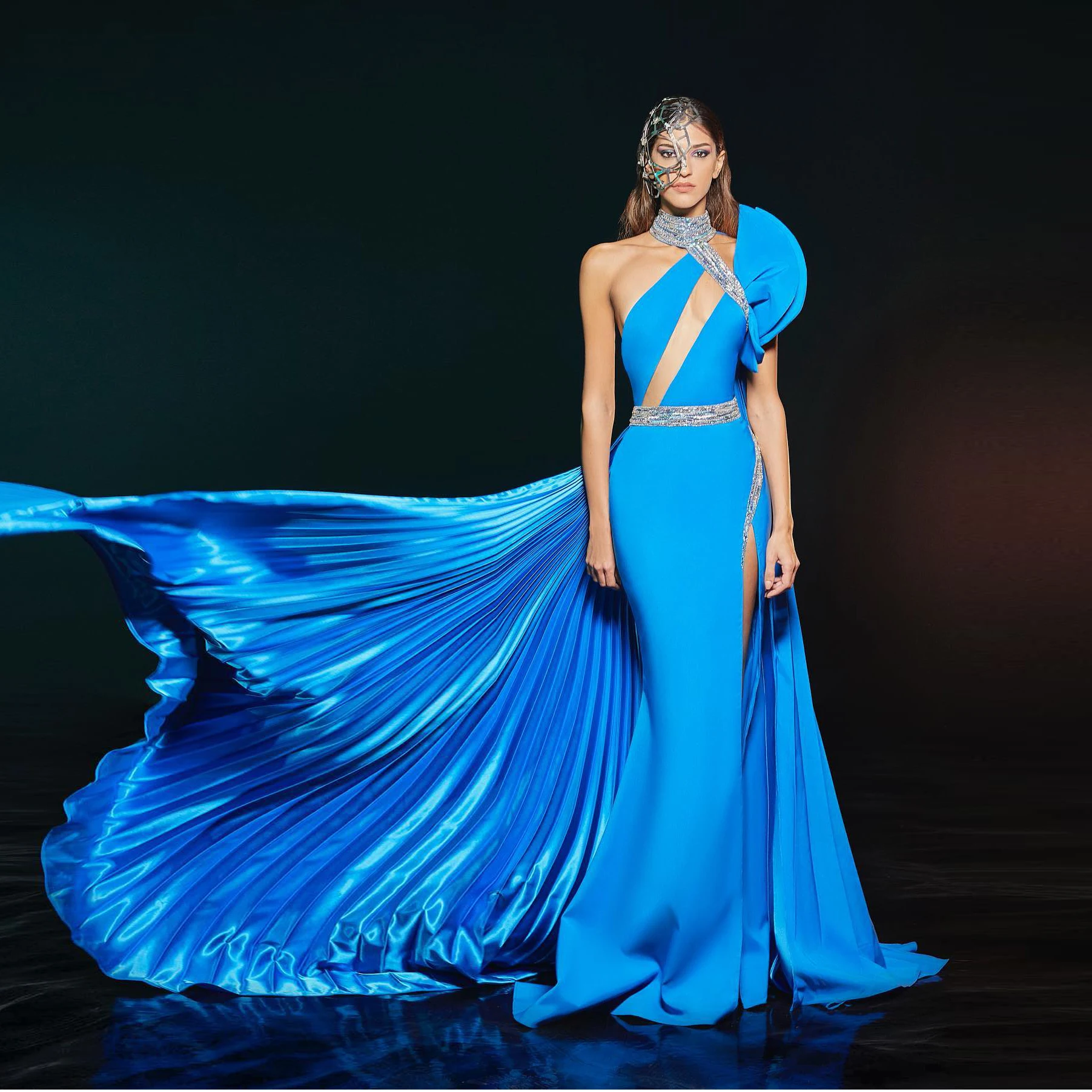 Шикарное морское синее длинное платье-Русалка для выпускного вечера, плиссированное платье с запахом и шлейфом, с блестками, с лямкой на шее, с открытым плечом, с разрезом