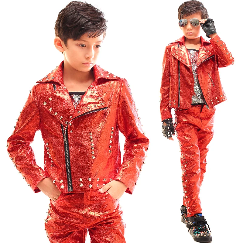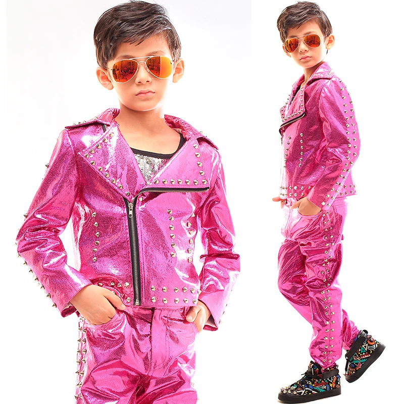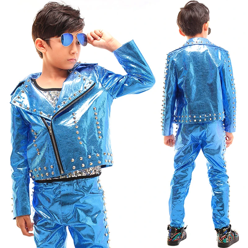Костюм для джазовых танцев для мальчиков, одежда в стиле хип-хоп, кожаная куртка с заклепками и брюки, костюм для выступлений и уличных танцев, блестящий сценический костюм DNV14077