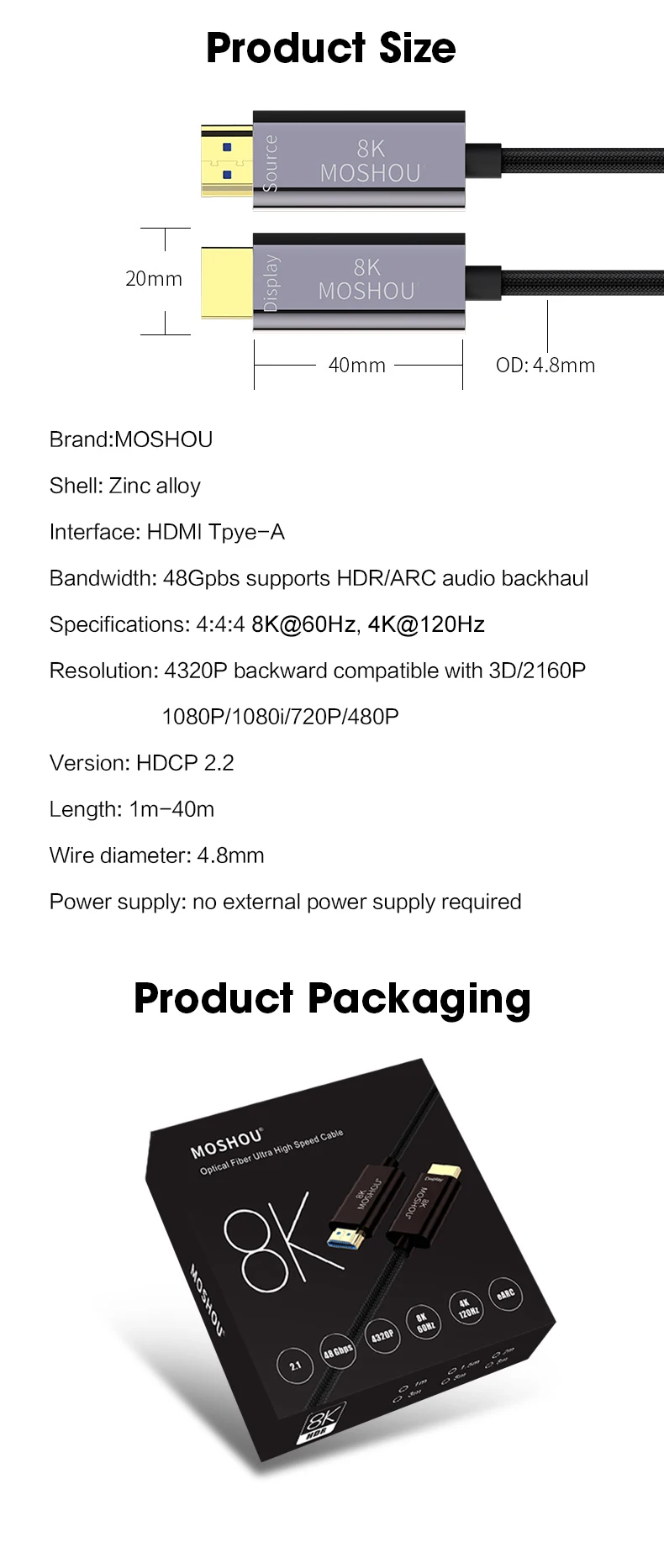 Оптическое волокно HDMI-совместимый 2,1 кабель eARC HDR 8K @ 60 Гц 4K @ 120 Гц оптический Ультра высокая скорость для PS5 RTX 3080 Xbox LG QLED TV