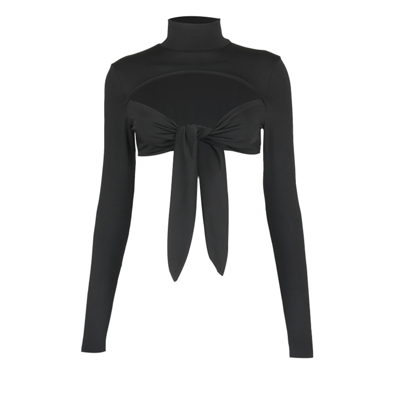 Женский сексуальный укороченный топ с длинным рукавом, водолазка, Короткие топы, Клубная уличная мода, глубокий вырез, бандажные черные футболки с узлом