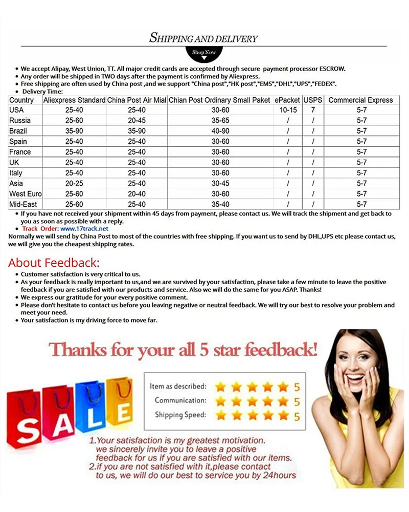 FAQ Это займет 5-7 рабочих дней. В: стиль доставки О: товары будут отправлены обычной авиапочтой Почта Китая. Информации об отслеживании нет, но она безопасна как заказная почта. Если общая сумма покупки превышает 5 долларов, мы отправим ее заказной почтой. И это займет 15-60 рабочих дней. При заказе выше $200 мы организуем доставку EMS, DHL, FEDEX, UPS, TNT или EMS, которая займет 5-7 рабочих дней. В: время доставки О: США 10-60 рабочих дней для России 25-55 рабочих дней для стран Южной Америки 25-60 рабочих дней. В другие страны 25-60 рабочих дней. Европейские и азиатские страны 15-60 рабочих дней.