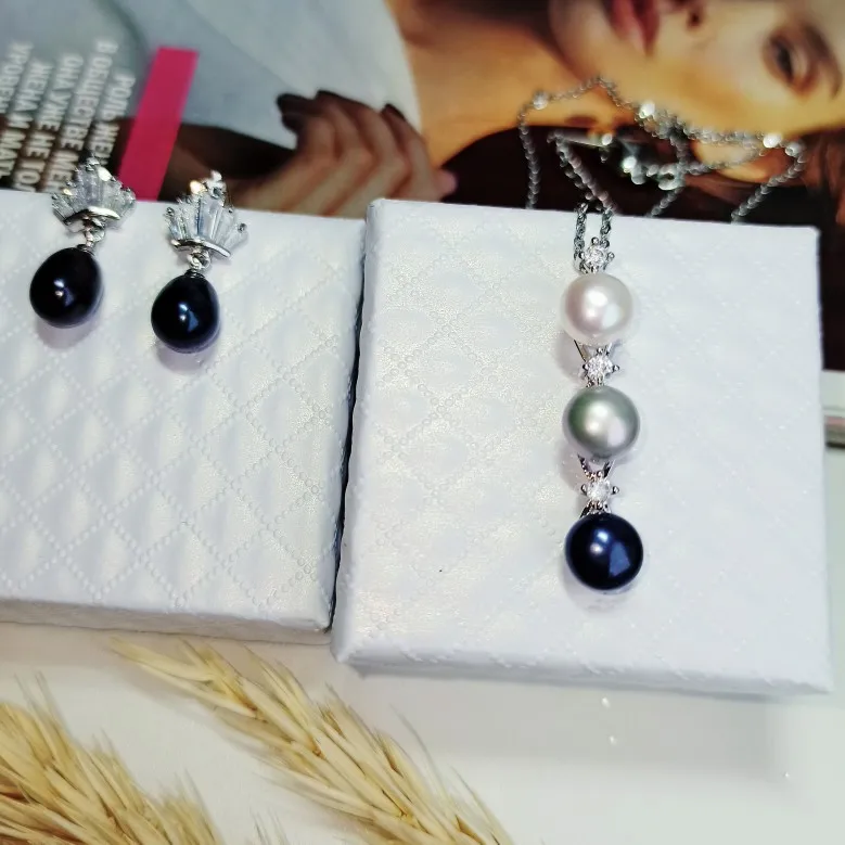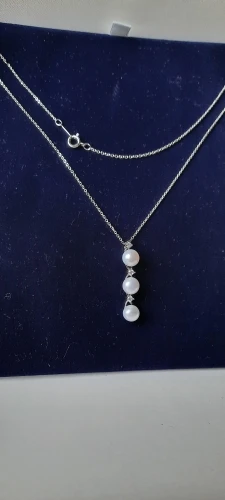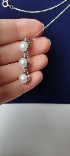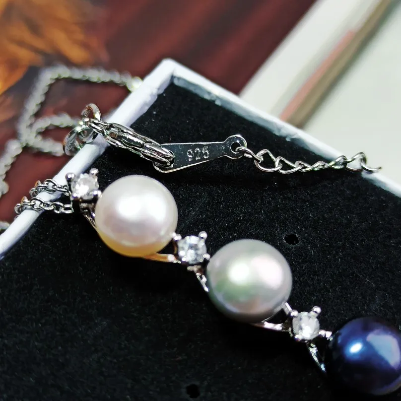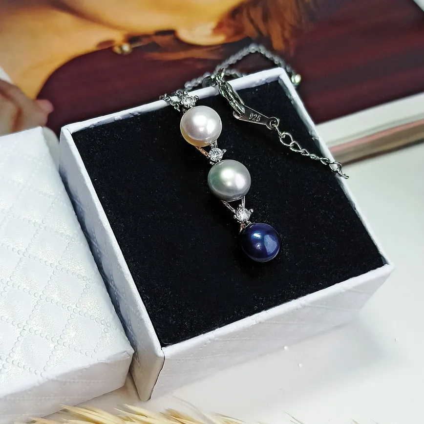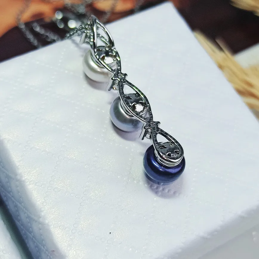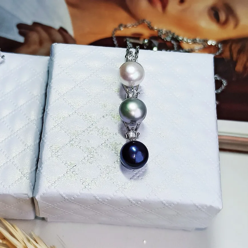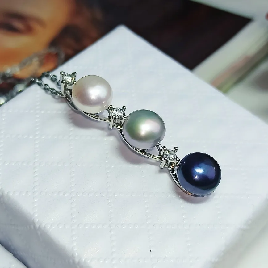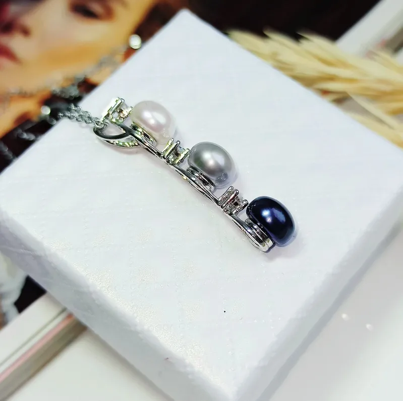 Подвеска из трех крупных круглых натуральных речных жемчужин. Очень нежное и изысканное украшение. Все три жемчужины разного цвета. Верхняя белая, средняя серая, нижняя черная с синим отливом. Между бусинами вставлены яркие прозрачные камушки в оправе. Жемчужины закреплены на серебряном основании в виде петелек для каждой из них. Держатся бусины крепко. Красивое украшение, понравилось. Рекомендую.