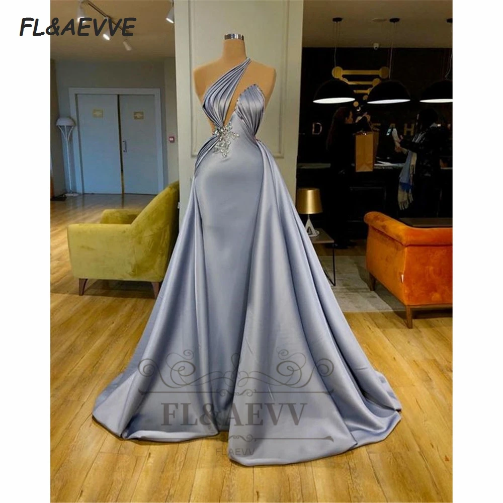 Вечернее платье-русалка без рукавов, серое эластичное атласное платье до пола с лямкой на шее, со шлейфом, вечерние наряды для выпускного вечера, 2021