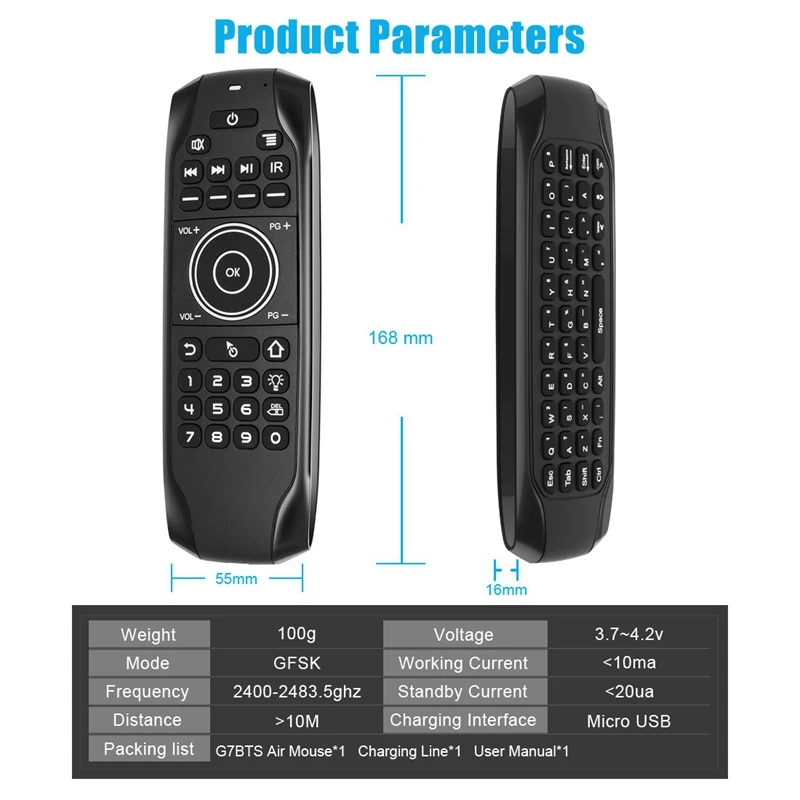 1. Идеальное нажатие, двухсторонняя кнопка, полная изогнутая модель клавиатуры-дизайн2. Использование беспроводного соединения Bluetooth5.0 с низким энергопотреблением, с сильной защитой от помех, а также светодиодный ными индикаторами для индикации состояния соединения3. Подсветка гравировки четко отображается по каждому символу4. Благодаря интеллектуальному алгоритму защиты от встряхивания курсор мыши стабилен и плавный5. Встроенная перезаряжаемая литиевая батарея; Встроенный 6-осевой Датчик гироскопа; 5 клавиш с поддержкой ИК-обучения (программируемый)Название: Воздушная мышь G7BTSПрименение: Рабочий столПрименение: ноутбукПрименение: планшетЯзык: английскийСтандарт клавиатуры: мини-клавиатураТип: беспроводной BluetoothСтиль работы: Проводящая резинаСтиль: СтандартныйТип интерфейса: USBПодсветка: ПоддержкаГироскоп: ПоддержкаИК-обучение: 5 клавиш с поддержкой ИК-обученияПоддержка работы при низком напряжении: 3,6-4,2 вСфера применения: smart tv /pc /android /tv box /mouse /tablet /phoneРазмер: 168x55x16 ммМатериал: АБСЦвет: черныйПосылка1 х Bluetooth мини клавиатура Air Mouse пульт дистанционного управления1 х зарядная линия1 х Руководство пользователяВ комплект входит только указанное выше содержимое, другие продукты в комплект не входят.Примечание: светильник вая съемка и различные дисплеи могут привести к тому, что цвет товара на изображении будет немного отличаться от реального. Допустимая погрешность измерения +/- 1-3 см.