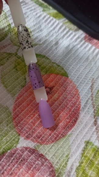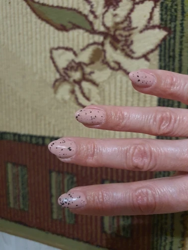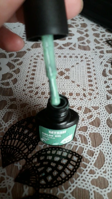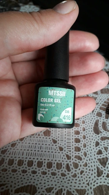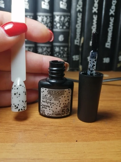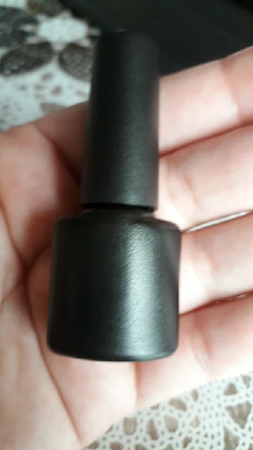 Гель не плохой,правда очень маленький.На натуре пока бордовый не пробовала,на типсе показался в 2 слоя не очень плотным.Который с крошками прикольный,как и любой гель с крупной блёсткой нужно кисточкой отдельно растаскивать,а так всё хорошо,спасибо