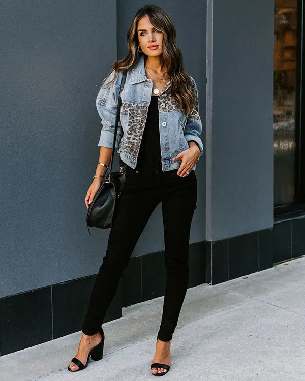 Женская джинсовая куртка с леопардовым принтом и длинными рукавами