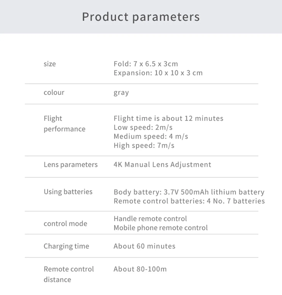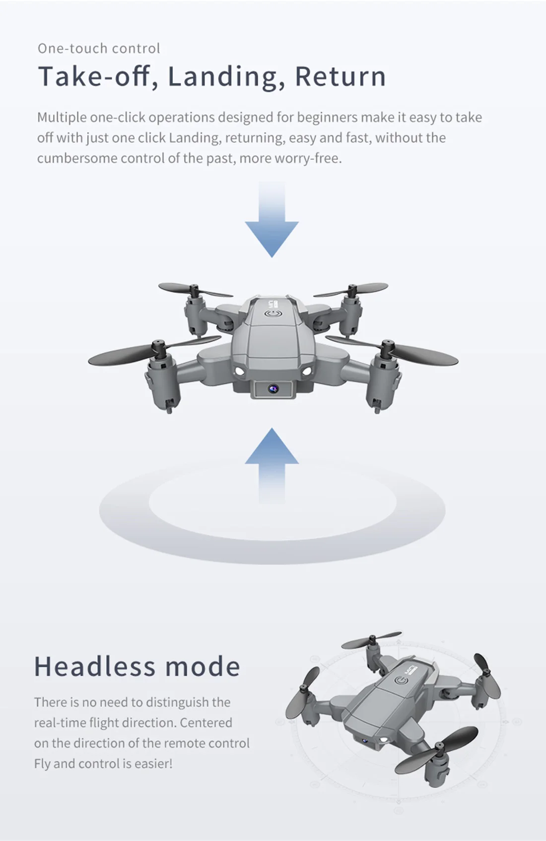 Особенности:-Складные руки, маленький размер всего 8 см, легко носить с собой.-С функцией режима удержания высоты, полет стабильный.-В безголовом режиме нет необходимости регулировать положение самолета перед полетом.-Одно нажатие: Взлет/посадка/возврат. Легко найти свой путь домой с помощью функции задней панели с одной кнопкой.-Встроенная hd-камера 500 Вт pixel /4K pixel. Удивительно, но он может снимать Потрясающие фотографии и видео с неба.-Переключатель двойной камеры, избавьтесь от фиксированного угла обзора.-С функцией Wi-Fi, он может быть подключен к приложениям, системе APK, и делать фотографии, видео и передачу в реальном времени через мобильный телефон изображения камеры.-Нарисуйте траекторию полета на экране, Дрон будет летать автономно по указанному пути.-VR 3D опыт. Через мобильное приложение с очками VR вы можете почувствовать пустоту с точки зрения.-Производство мВ, музыкальное дополнение.-3,7 V 500 мА/ч, модульная батарея, просты в установке и взять, время работы от аккумулятора до 12 минут.-2,4 ГГц технологии анти-помех.-4 канала для подъема, спуска, вперед, назад, левого полета, правого полета и 360 ° рулона.-Шестиосевой гироскоп, плавный полет и более удобное управление.-Светодиодный светильник делает полет более эффектным, особенно в темноте.