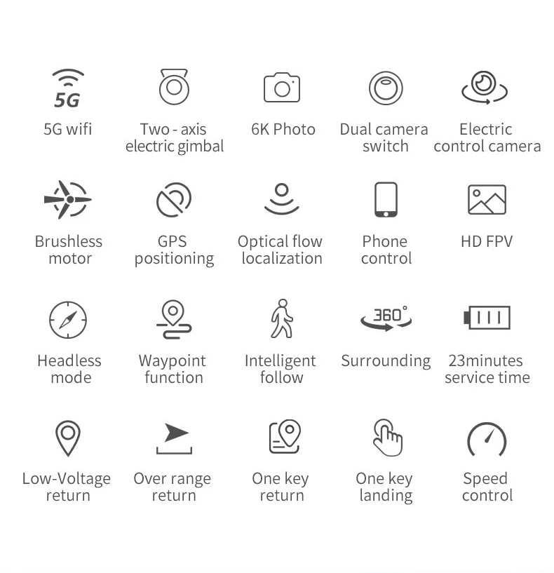 1. Камера 6K: оснащена двухосным самостабилизирующим противовесом панорамирования/наклона, угол камеры (90 °) можно регулировать через пульт дистанционного управления; камера с высоким разрешением 6K (5700*4275P) может снимать четкие изображения красивых пейзажей с отличными цветовыми решениями и записывать каждый незабываемый момент.2. Двойная система позиционирования: Дрон обладает двойной позиционной системой, оптической системой позиционирования потока и GPS позиционирования в точном положении и удержании высоты, что делает Дрон более стабильным в полете и фотографии.3. Полет в пути: с помощью этой функции вы можете нарисовать траекторию на экране, и самолет будет летать по этой траектории с текущей позицией, которая предлагает Отличное развлечение для вас.4. Режим управления ладонью: перед объективом самолета, поднятие одной рукой, и когда режим управления ладонью выбран, самолет будет следовать за движением ладони. Просто наслаждайтесь таким гибким и интерактивным контролем.5. Автоматическое следующее: в следующем режиме me, лицом к объективу самолета и выбирая цель, он будет автоматически следовать по вашей трассе и захватывать ваше движение с удивительным воздушным видом.6. Выполните жест фото/видео: он позволяет сделать снимок камеры с победный жест и снимать видео, что создает ладонью или квадратные жест.7. Интерфейс MV: нажмите на значок «MV» в интерфейсе управления приложением. После входа в интерфейс MV вы можете начать запись, а затем получить свой уникальный MV.При возникновении любых проблем, пожалуйста, свяжитесь с нами без колебаний. Честь служить вам.