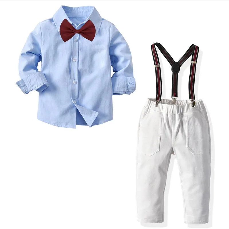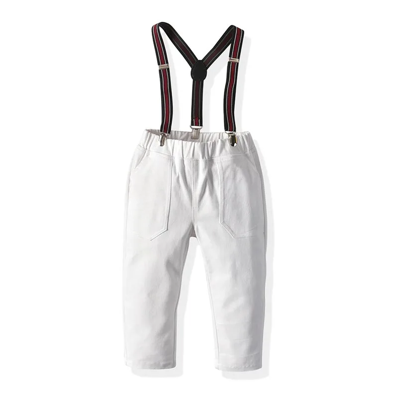 Костюмы для мальчиков, рубашка + брюки на бретелях, 2 шт., официальный Блейзер, британский джентльменский кардиган, Свадебный комплект одежды, детское платье