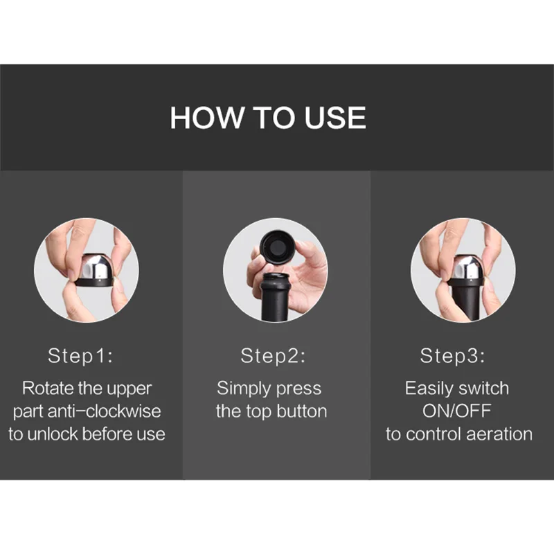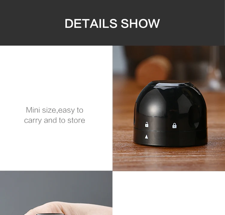Интимный дизайн пальцев, более удобный в использованииВ сочетании с поворотным замком, верхняя часть пробки шампанского тщательно добавляется с тремя маленькими канавками, чтобы соответствовать пальцу живота, что делает его легче оказывать силу при вращении