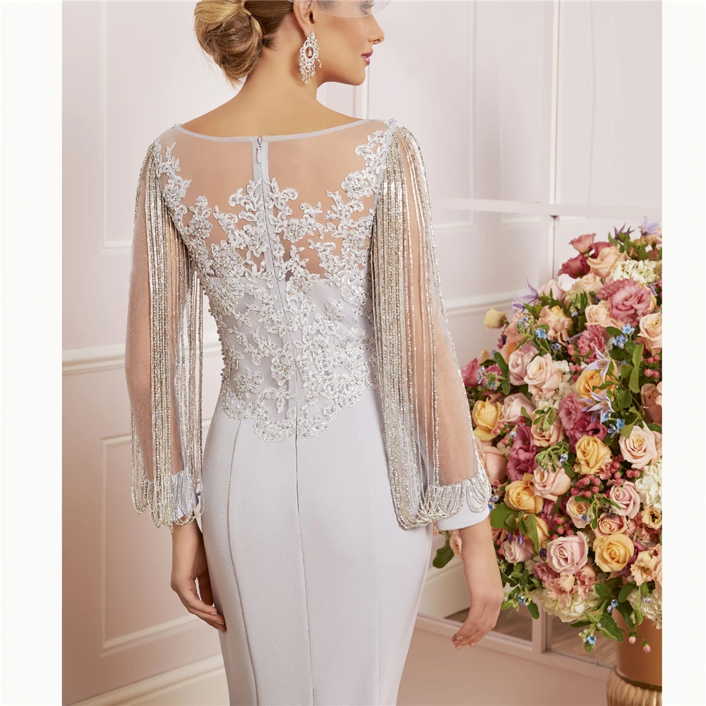 Новое поступление! Превосходное длинное серебряное Платье-футляр длиной до колена с длинными рукавами и бисером для матери невесты