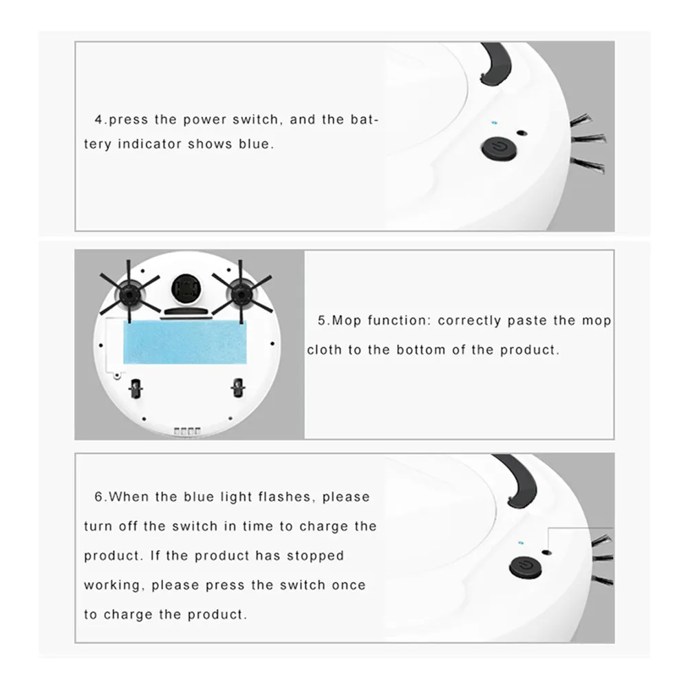 Функции: запуск одной кнопкой, подметание, уборка, пылесос, зарядка через USB, универсальное вождение, автоматическое Предотвращение препятствий, защита от падения, низкий уровень шума, сильное всасывание, низкое повторение, высокий охват