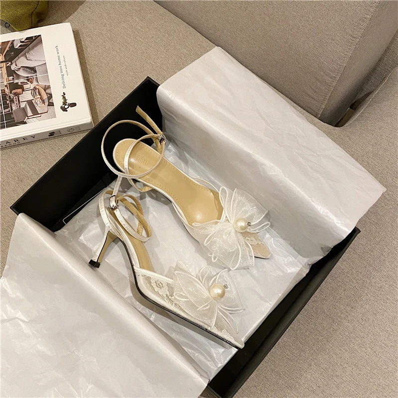 Тонкие Туфли с острым носком на тонком каблуке; Свадебные туфли; Босоножки на высоком каблуке с бантом сзади