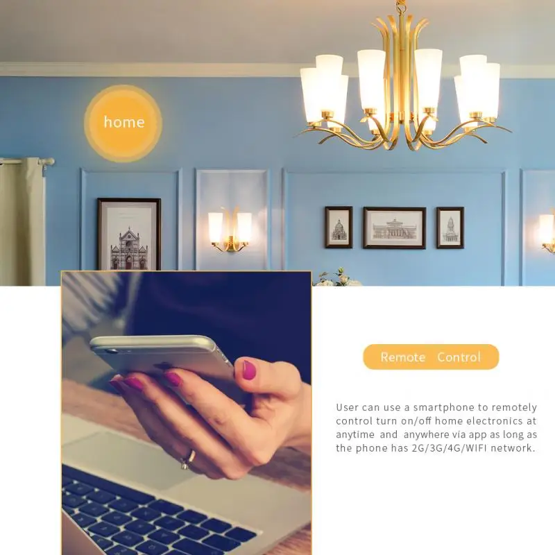 Используйте r можно использовать смартфон для удаленного управления включением/выключением домашней электроники в любое время и в любом месте с помощью приложения до тех пор, пока телефон имеет 2G/3G/4G/WIFI сеть.
