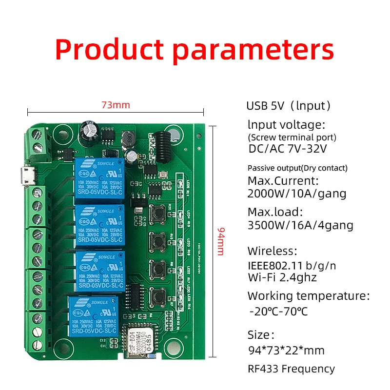 USB 5 В (вход)Вход напряжения (Винтовые клеммы порт) :DC/AC 7V-32V постоянного токаПассивный выход (сухой контакт)Макс. Ток: 2000 Вт/10А/бандаМаксимальная нагрузка: 3500 Вт/16А/4 комплектаБеспроводной: IEEE802.11 b/g/n,Wi-Fi, 2,4 ГГцРабочая температура: -20 °-70Размер: 94*73 "22 * ммЧастота RF433