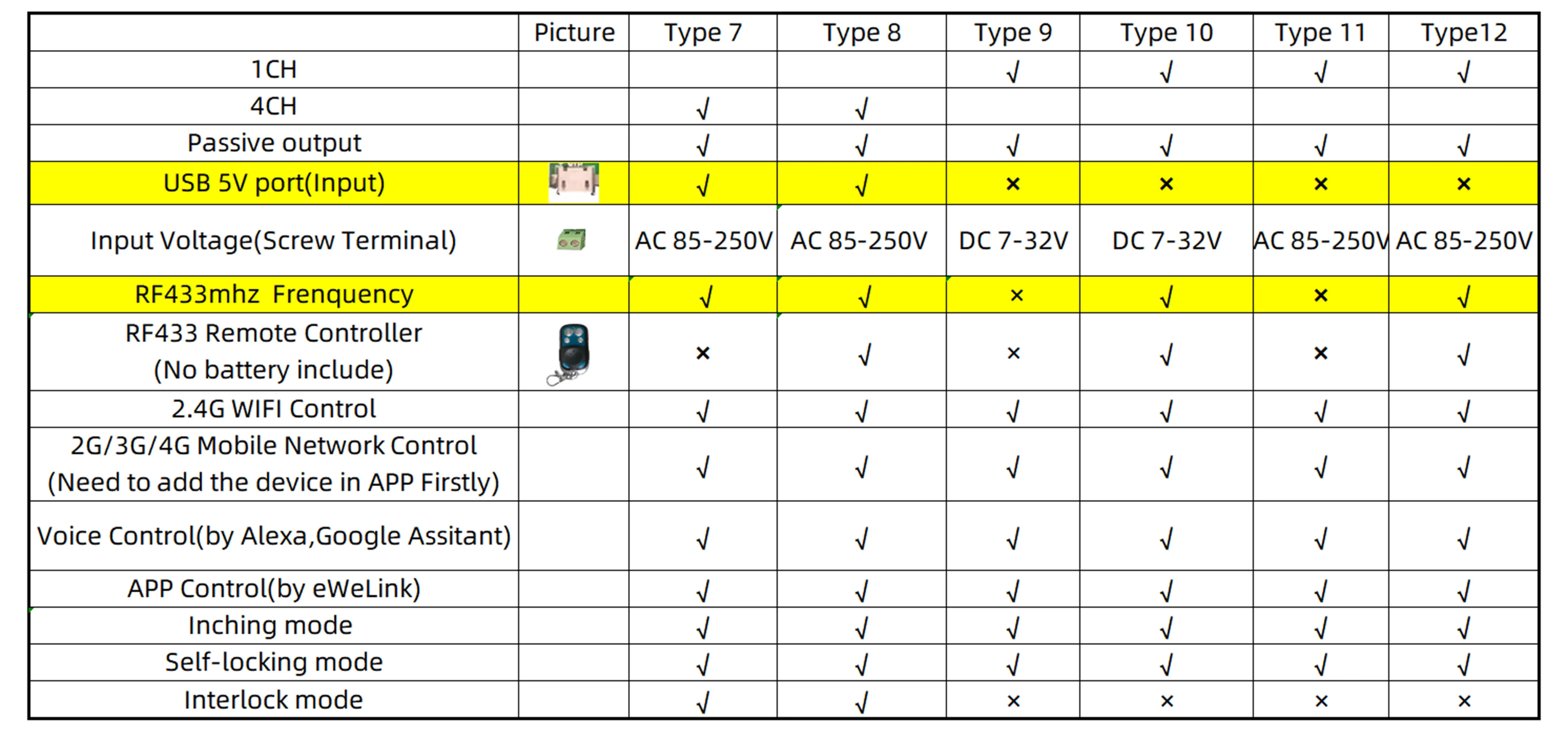 Тип 9,10,11,12 не имеет входного порта USB 5V.Тип 1,3,5,9,11 не поддерживает частоту RF433.RF433 пульт дистанционного управления не включает аккумулятор: 27A 12V