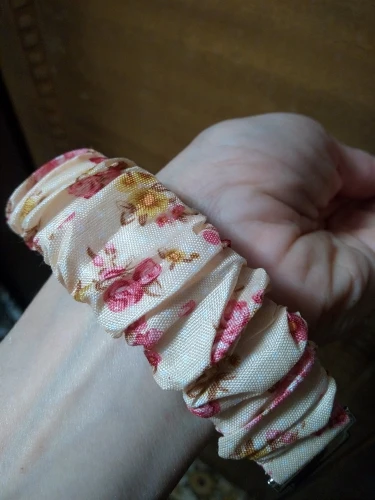 Браслет отличный! Все как в описании. Пересылка долгая, но я довольна. Ткань синтетическая. Размер на худенькую руку, резинка тянется туго. С продавцом не общалась.