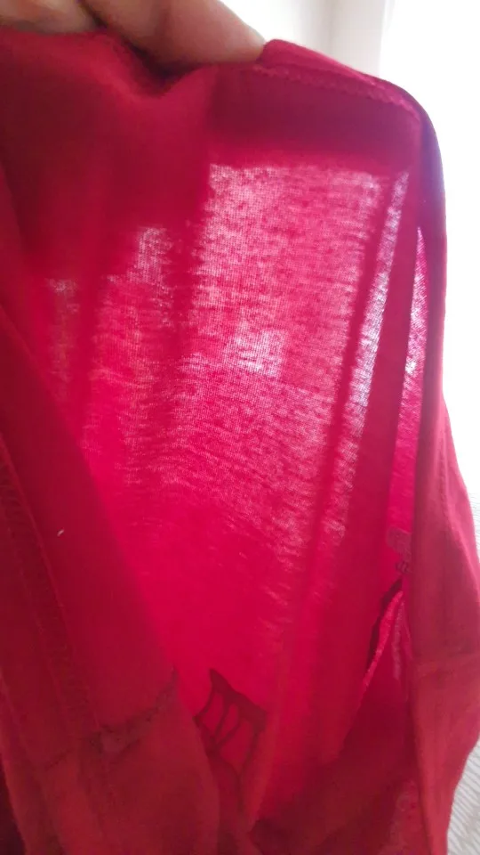 Он тонкий, почти прозрачный, прямой крой, не подходит к женскому телу, он немного свободен. Я выбрал размер S, и когда он не подходит, он немного широкий (спина и плечи хорошо. Цвет не тот же, он больше похож на красный, а не на вино. Рисунок виниловый и склеен и, кажется, впитывает красный оттенок, поэтому куклы имеют красный оттенок.