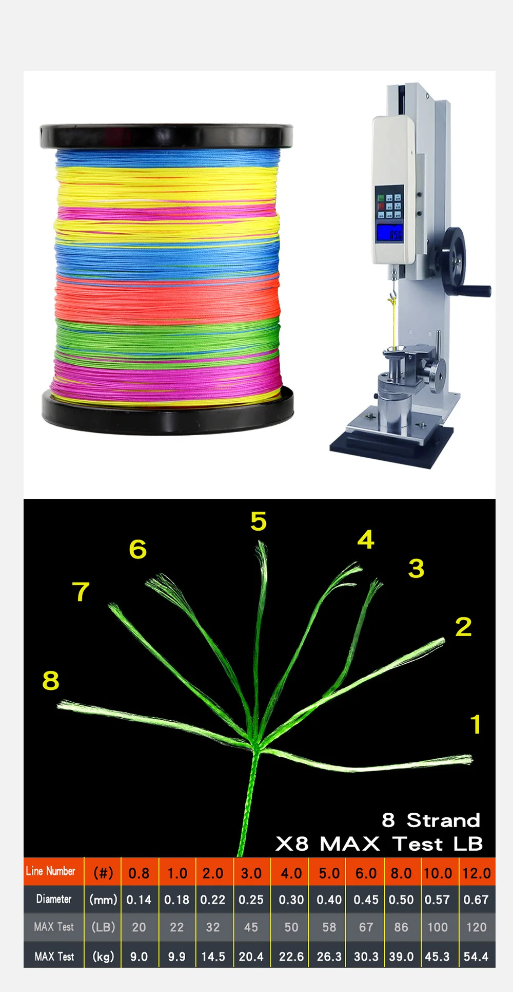 Номер лески 0,8 #: 0,16mm / 20LB/5,1 кг номера лески 1,0 #: 0,18mm / 22LB/9,1 кг номера лески 2,0 #: 0,22 мм/32 фунта/13,7 кг номер лески 3,0 #: 0,28 мм/45 фунтов/18,2 кг номер лески 4,0 #: 0,32 мм/50 фунтов/22,7 кг номер лески 5,0 #: 0,37 мм/55 фунтов/28 кг номер линии 6,0 #: 0,42 мм/75 фунтов/35,4 кг номер лески 8,0 #: 0,50 мм/86 фунтов/40 кг