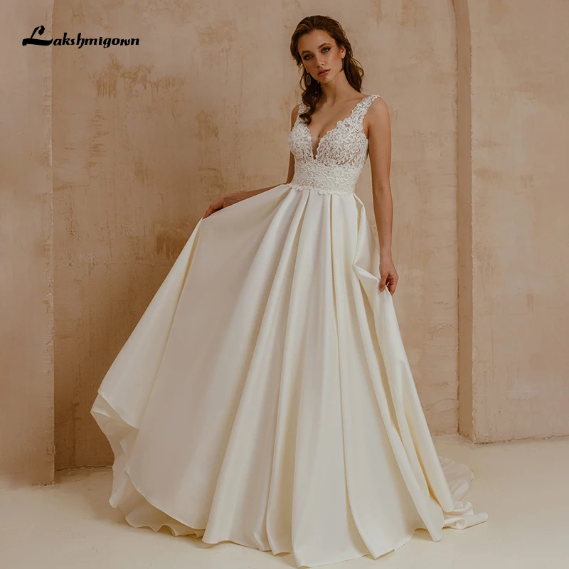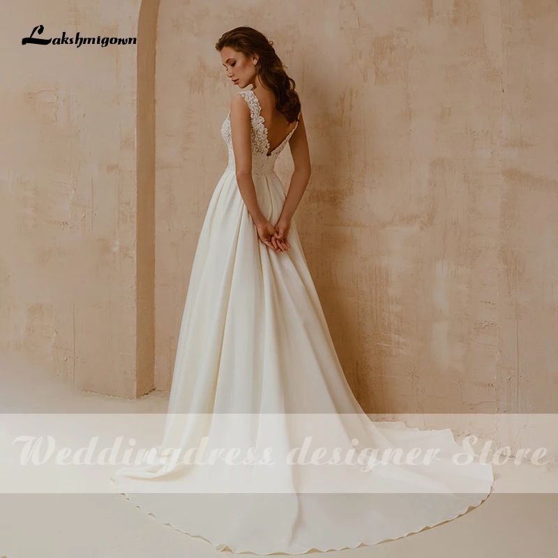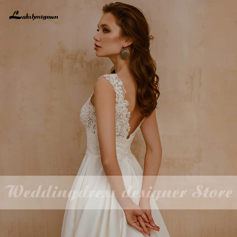 Платье Laksgmigown свадебное атласное с V-образным вырезом, ТРАПЕЦИЕВИДНОЕ, с открытой спиной и бусинами, 2021