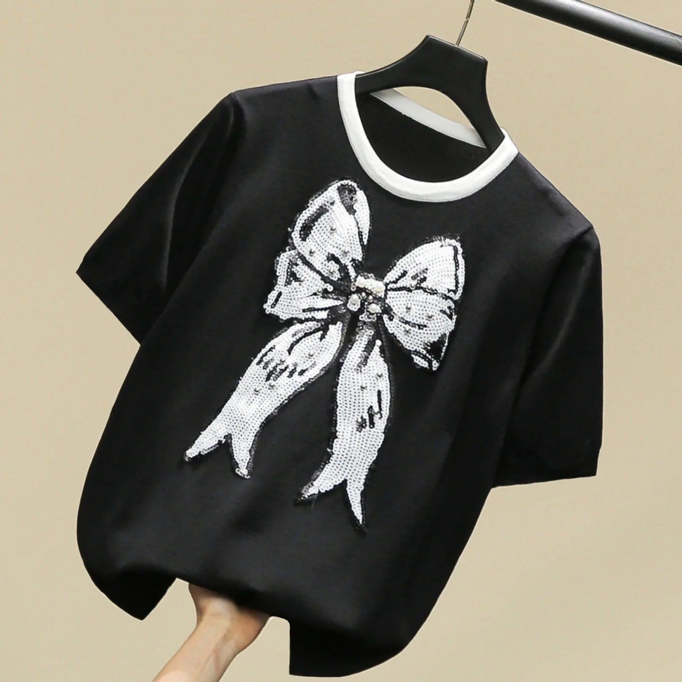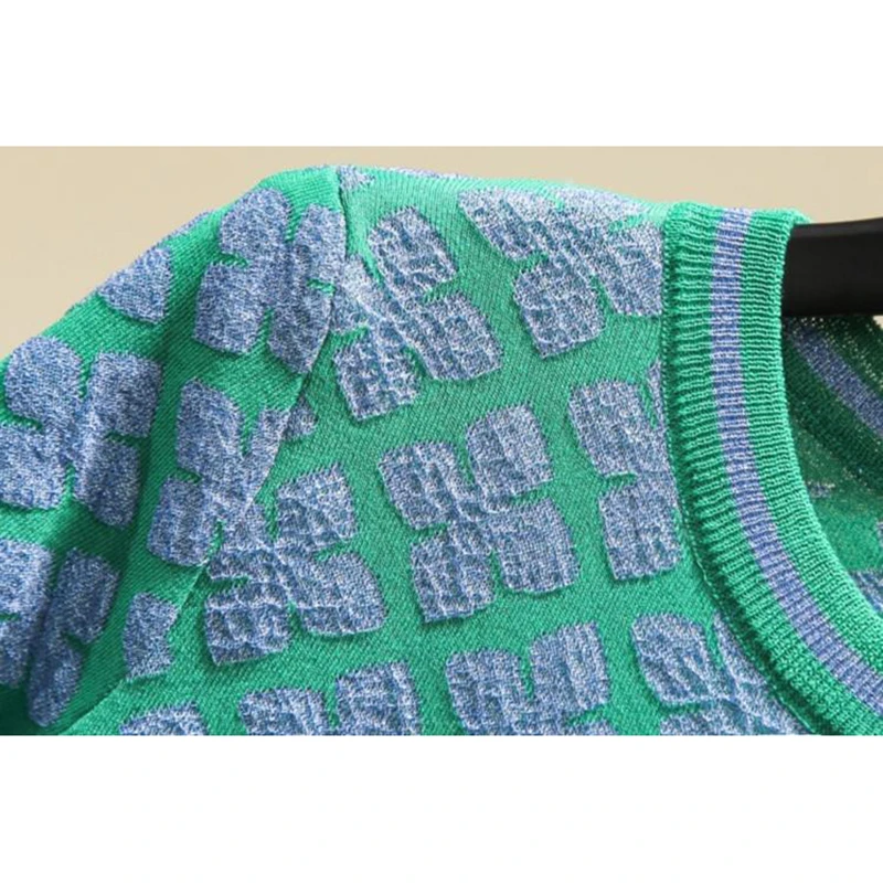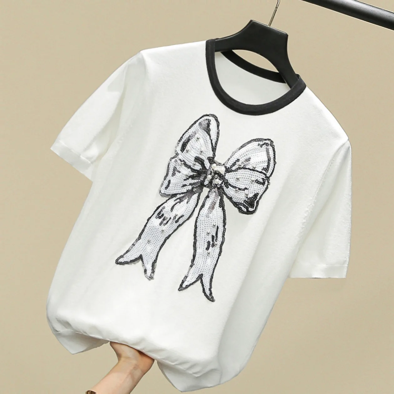 Женский вязаный пуловер с коротким рукавом, свитер ручной работы с блестками и бантом, модные топы, весна-лето 2022