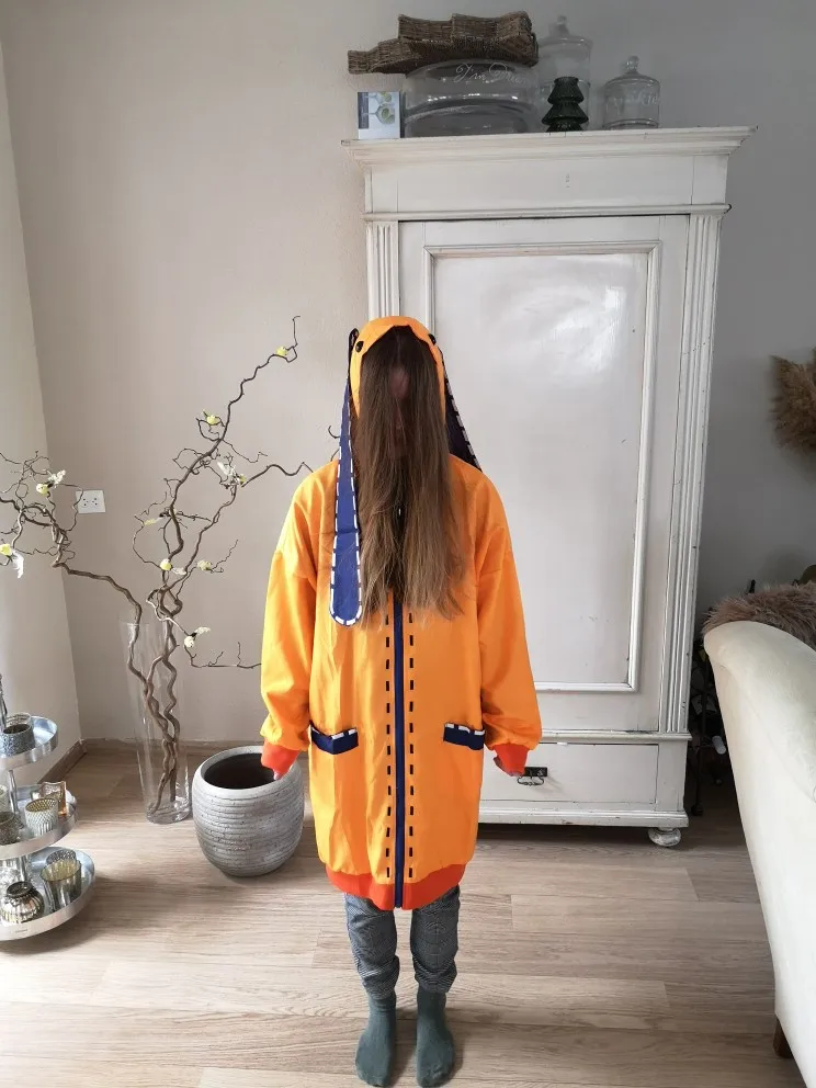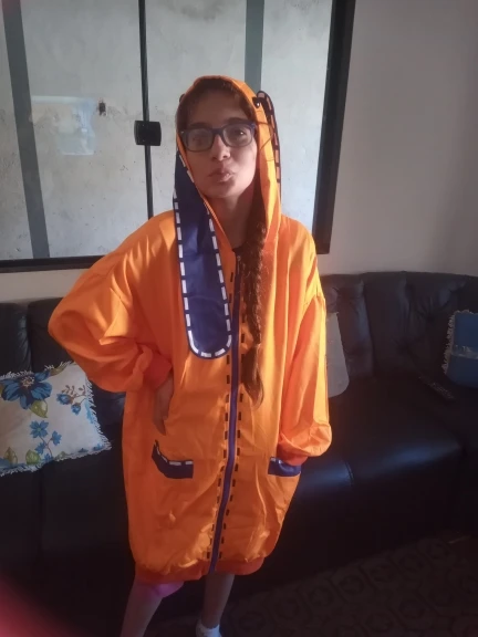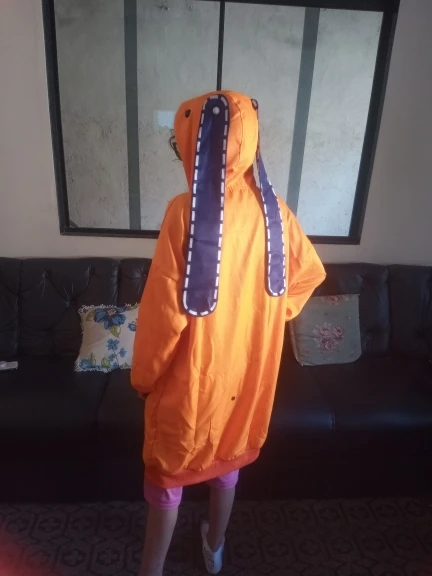 Кофта хорошая, немного лезут нитки, ткань вроде синтетика но приятная к телу, хвост на поговице, уши пришиты, сидит хорошо, но рукава немного короткие,а так всё хорошо, кофта очень понравился, плюс в подарок шел брелок, и пришло где то за 2-3 недели, и в итоге получился прикольный закос.<3
