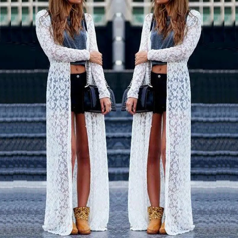 Женский цветочный кружевной пляжный длинный кардиган, повседневный белый накидка для бикини, длинное пляжное платье, кафтан