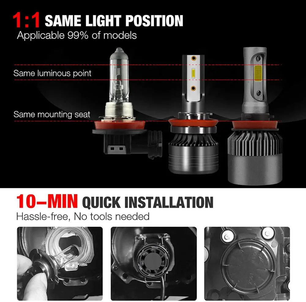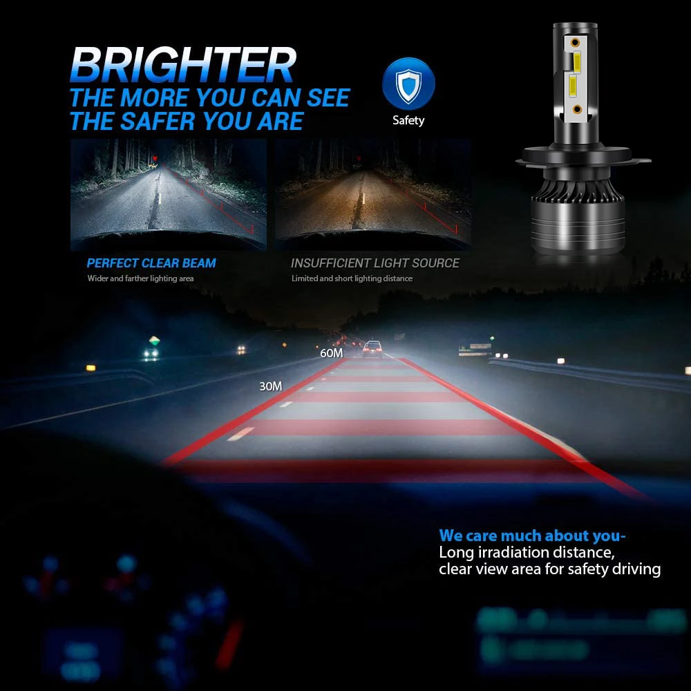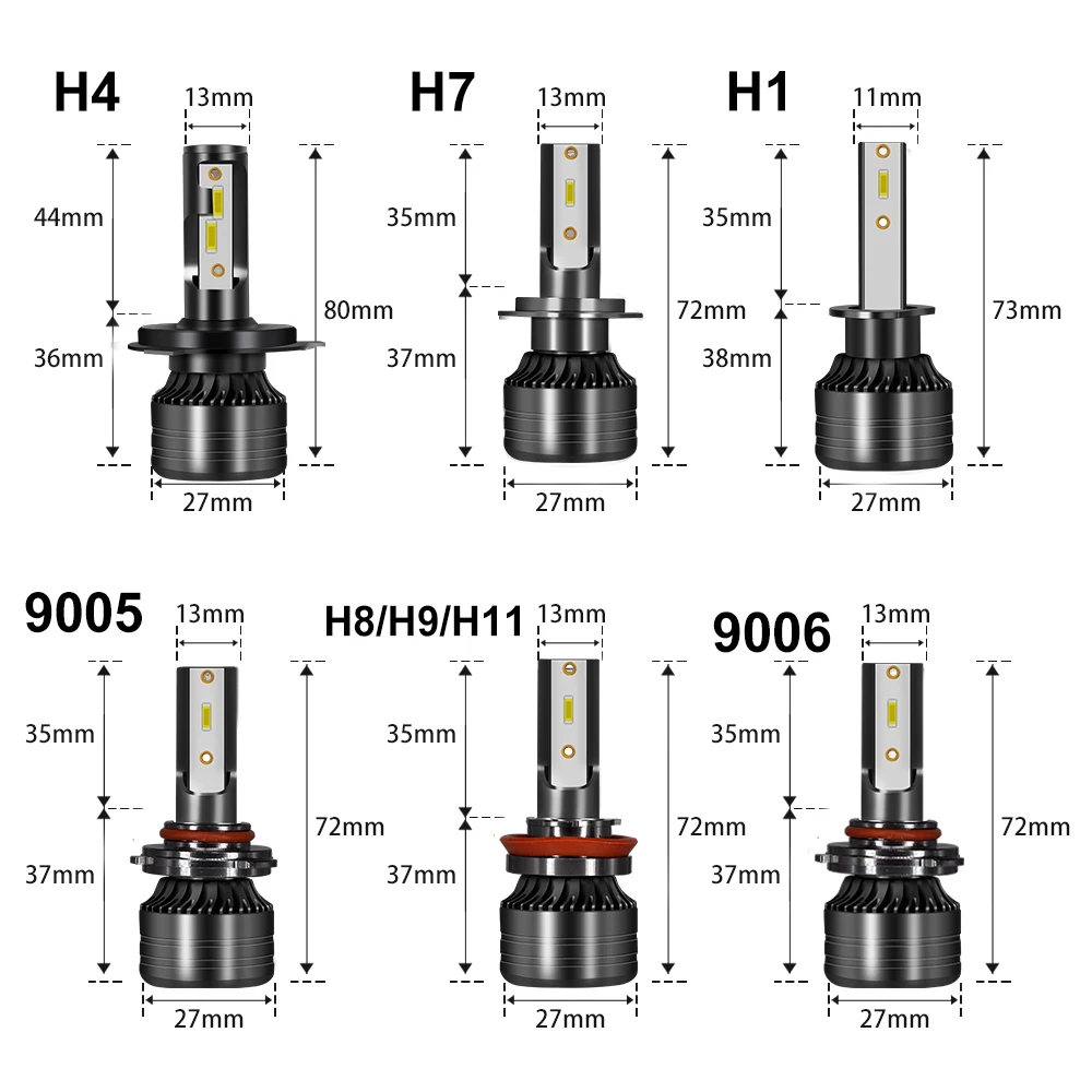 Упаковка включает: 2 шт. светодиодные фары Модели и размеры розеток: Дальний/ближний свет: H4 с 4 светодиодными чипами Один луч: H1 H7 H8 H11 9005 HB3 9006 HB4 с 2 светодиодными чипами Описание товара: Встроенный интеллектуальный привод EMC, Canbus без ошибок, анти-интеренс Светодиодный чип: супер яркий импортный светодиодный чип Мощность: 60 Вт/пара Световой поток: обновление CSP 14000LM/пара Напряжение: DC12V Цветовая температура: 6000K чисто белый Материал: алюминиевый корпус быстро нагревается Рабочая температура: -40 ~ + 120 градусов Цельсия Более 50000 часов продолжительности жизни Все в одном мини размер дизайн играть и подключать Вентилятор быстрого охлаждения 12000 об/мин IP65 водонепроницаемый дизайн Гарантия 1 год Использование: автомобильная светодиодная лампа для фары