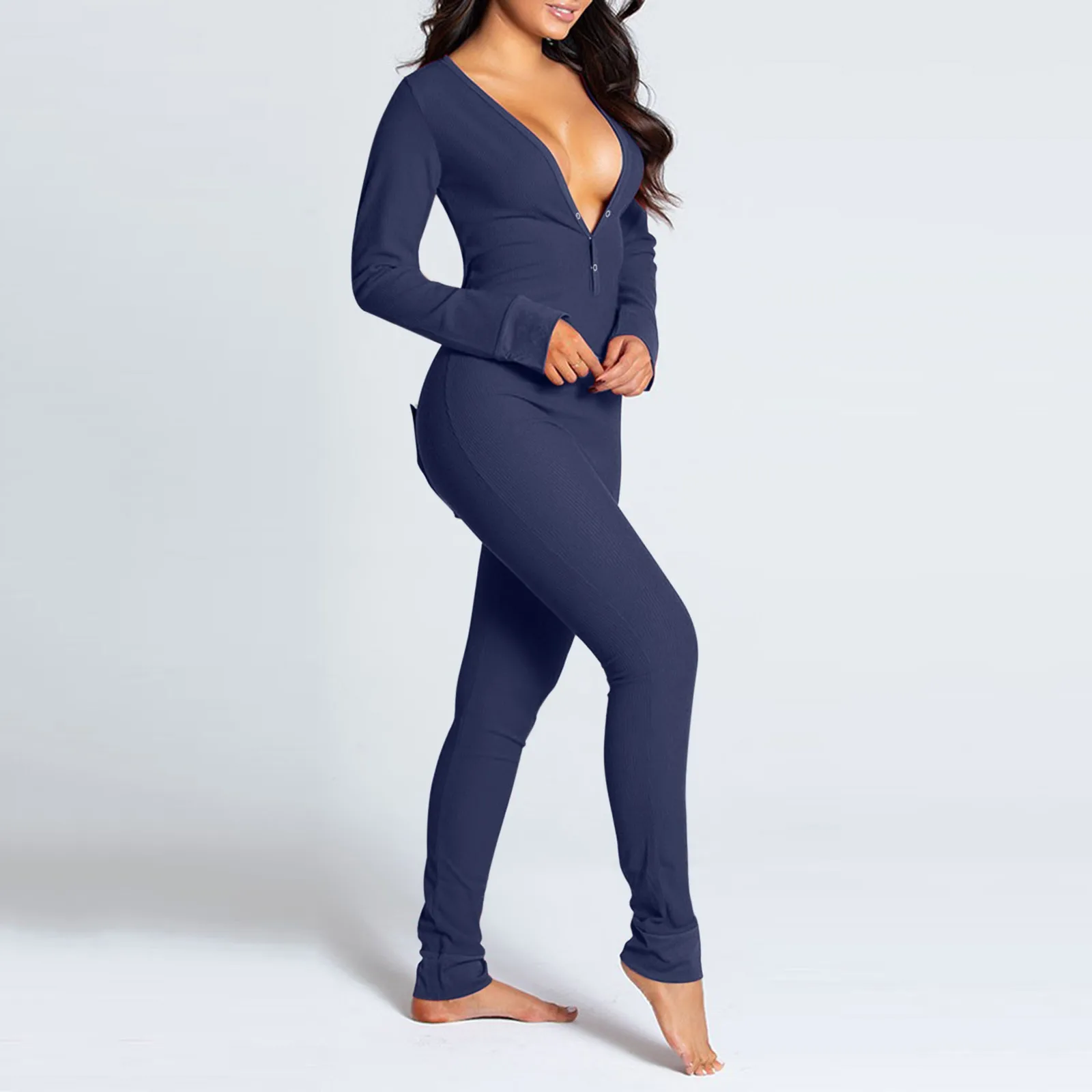 Женские пижамы, повседневные, модные, однотонные, женские комбинезоны, на пуговицах, комбинезон, сексуальные, с v-образным вырезом, одежда для сна, Осень-зима, с длинным рукавом, боди P