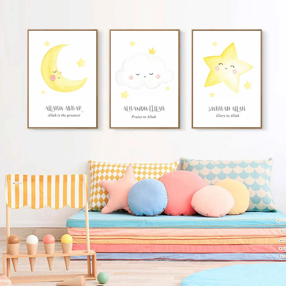 Исламская современный желтого цвета с персонажами мультфильмов Луна, Звезды настенный художественный холст картины постер для детской комнаты и принтами для малышей и детей постарше Спальня домашний декор