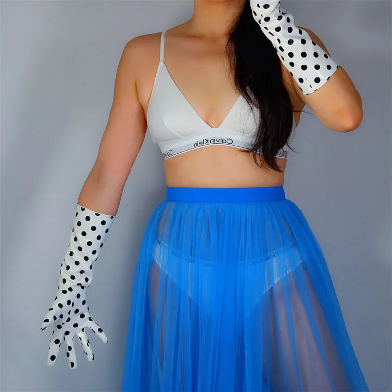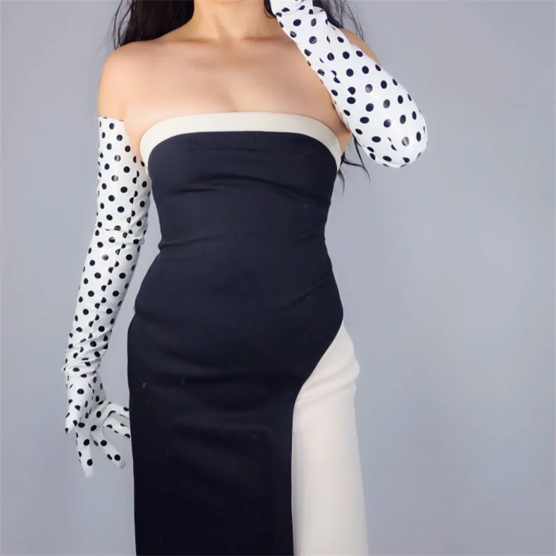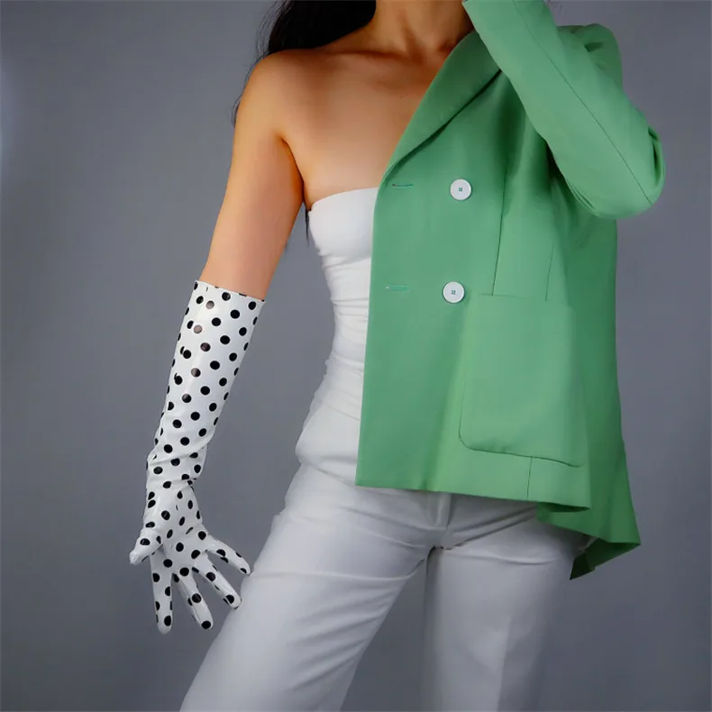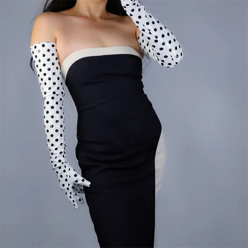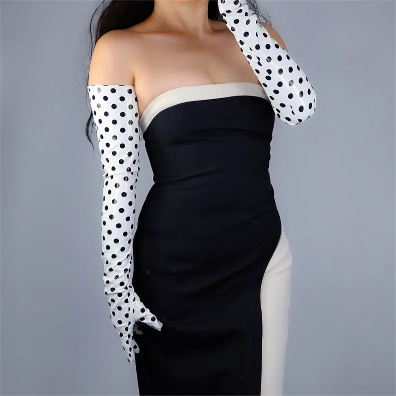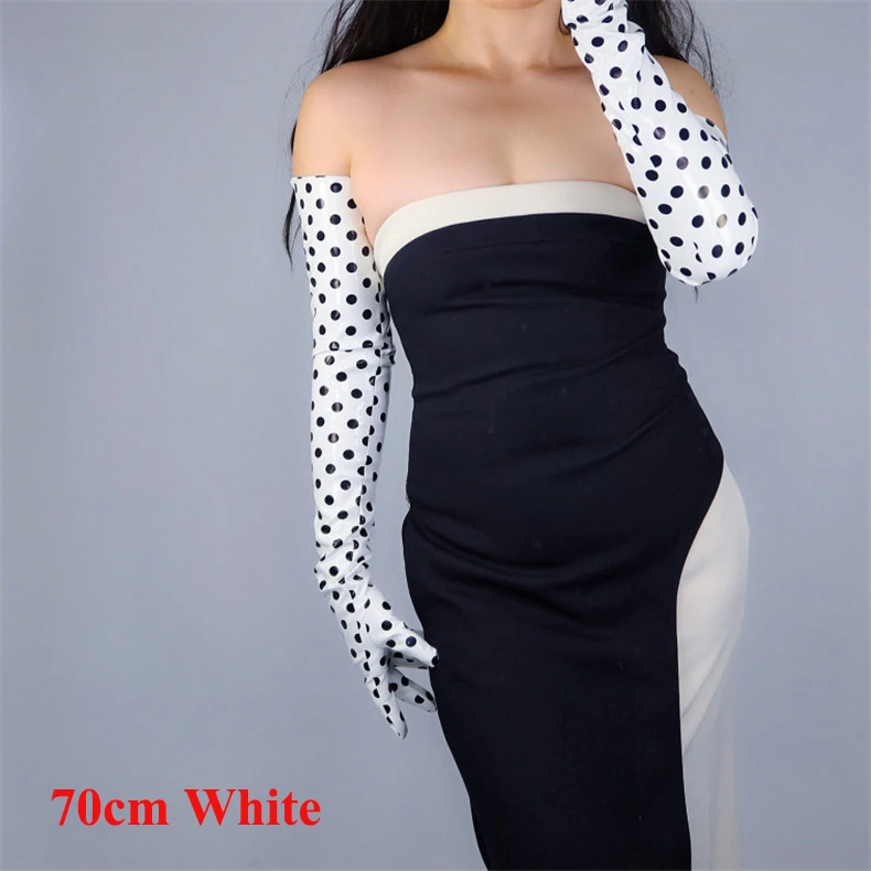Новые длинные женские перчатки в мелкий горошек 70 см тонкие лакированные кожаные белые черные в горошек из искусственной кожи женские длинные кожаные перчатки WPU299