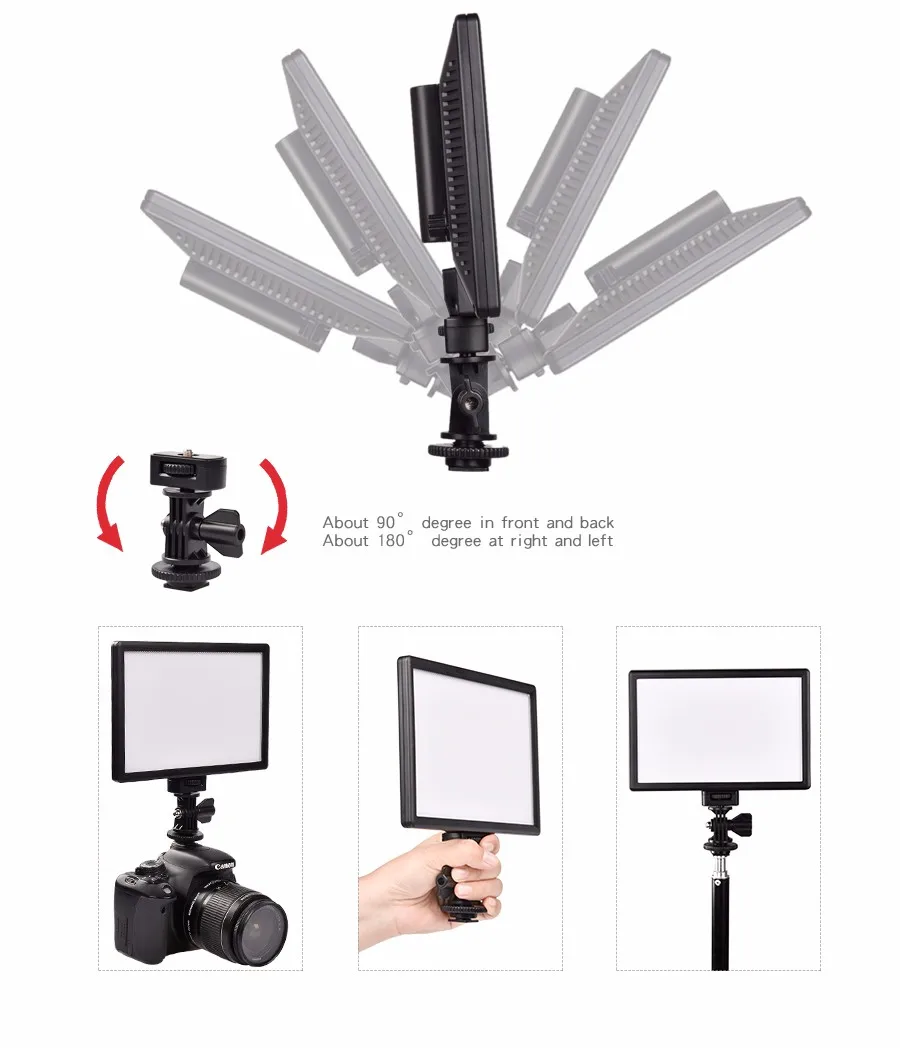 С креплением на Холодный башмак светильник может работать непосредственно с камерами и видеокамерами Canon Nikon Sony DSLR; Оснащен стандартным винтовым отверстием 1/4, он также позволяет устанавливать светильник на подставке, штативах и т. д. Он поддерживает 90 градусов регулировки спереди и сзади, чтобы обеспечить идеальный угол съемки.