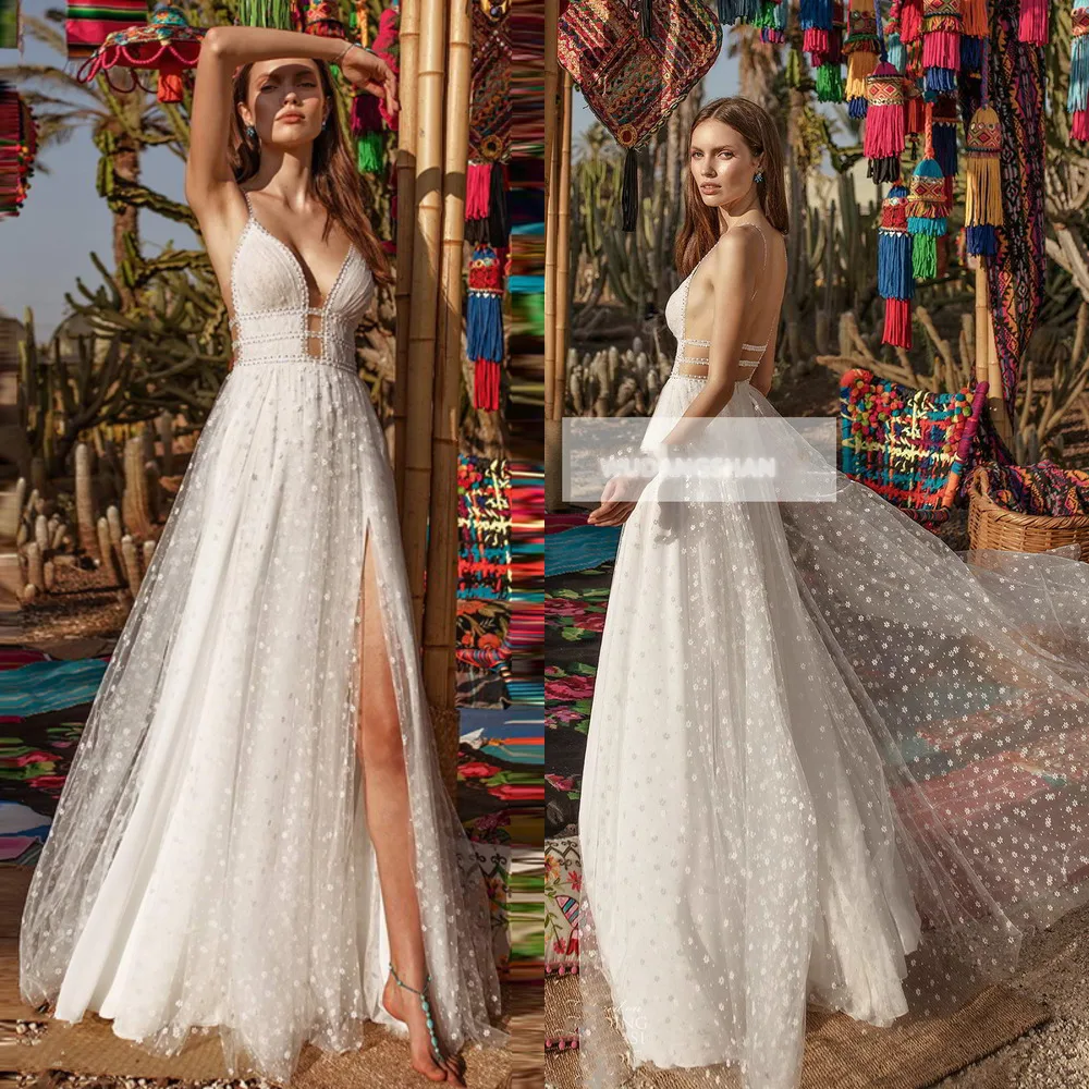 Пляжное свадебное платье-бохо, кружевное фатиновое и шифоновое свадебное платье 2020, Элегантное свадебное платье с Боковым Разрезом Vestidos De Novia Brautkleid