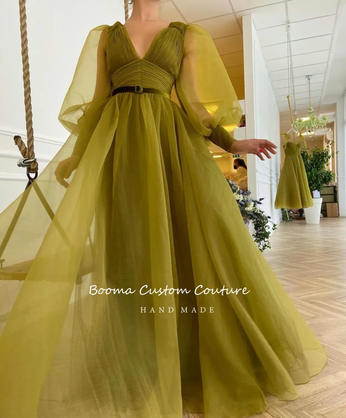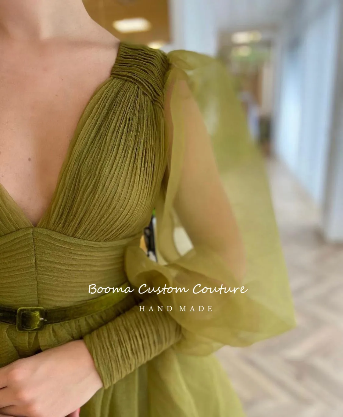 Женское Плиссированное вечернее платье Booma, зеленое плиссированное платье-трапеция с V-образным вырезом и длинными рукавами-фонариками, с поясом, для выпускного вечера, платья из органзы для выпускного вечера